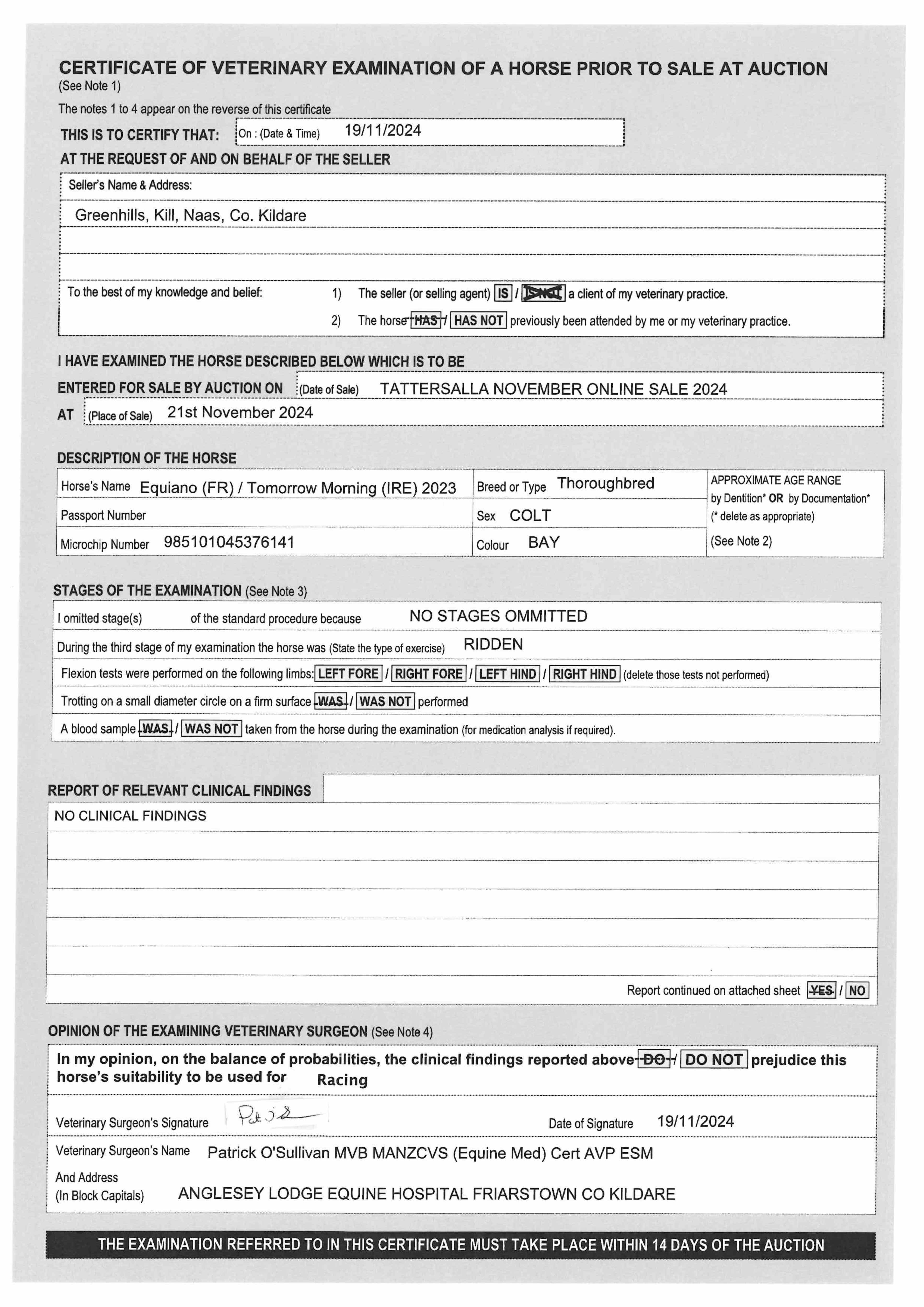 Online Sale - 25th October 2024 lot 111, Greenhills Farm, Ireland=>Lot Not Sold 1,000 gns