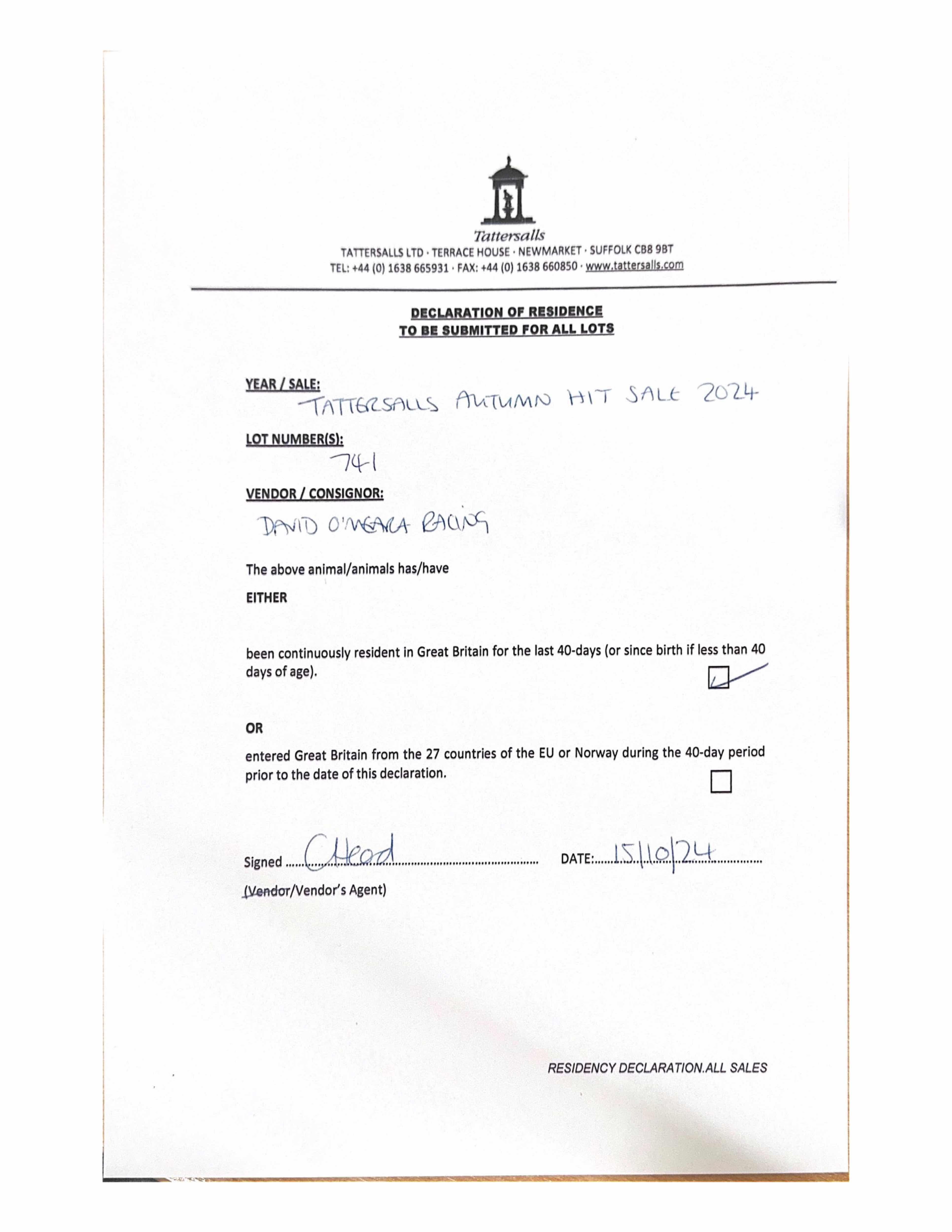 July Sale 2024 lot 592, Baroda Stud, Ireland=>Vendor 28,000 gns