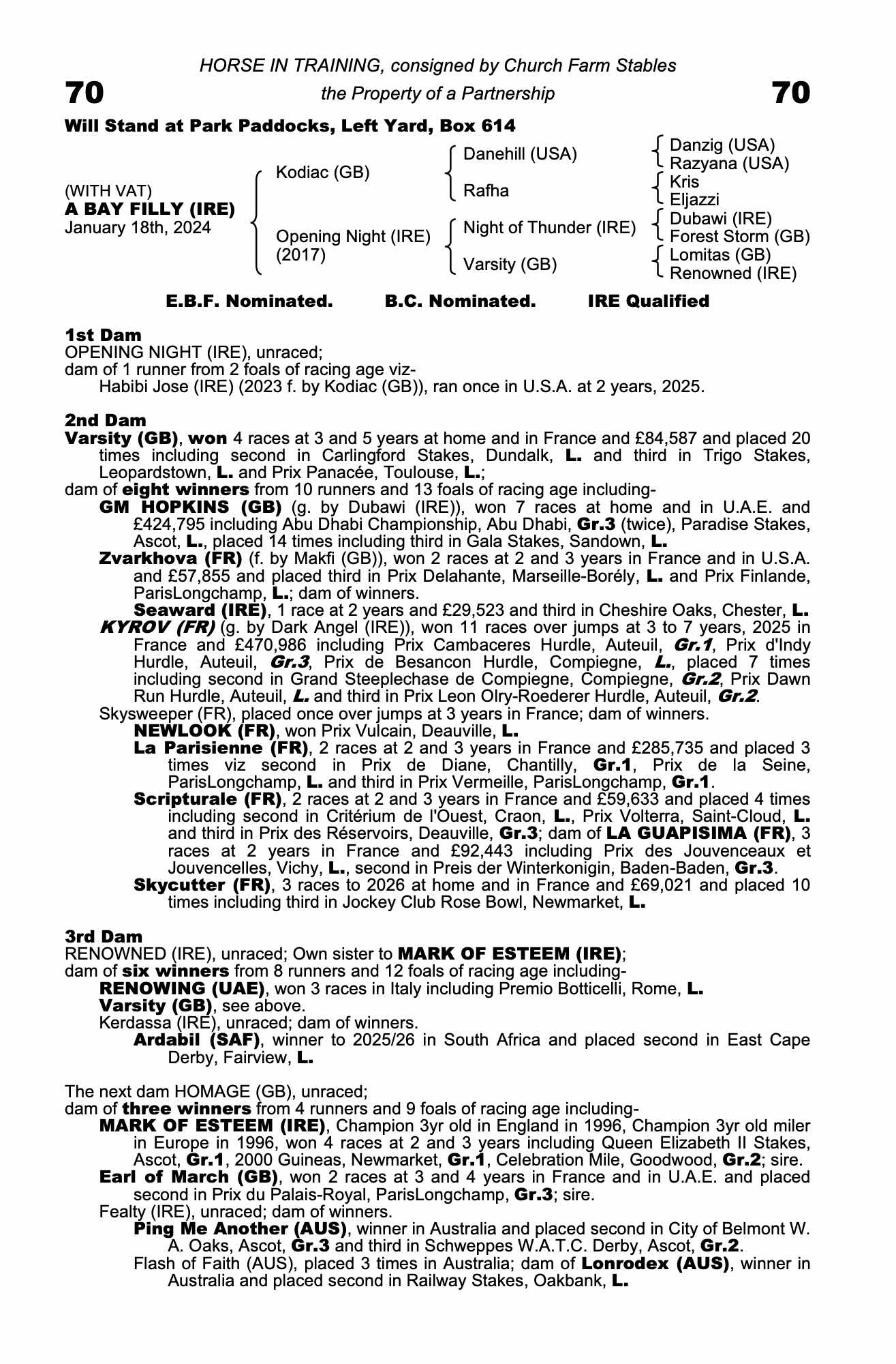 Under 2nd dam, Skysweeper (FR), dam of: WE'LL DEFEND (FR), 2 races at 3 and 4 years, 2026 in France and £32,253 including Prix Zarkava, ParisLongchamp, L..