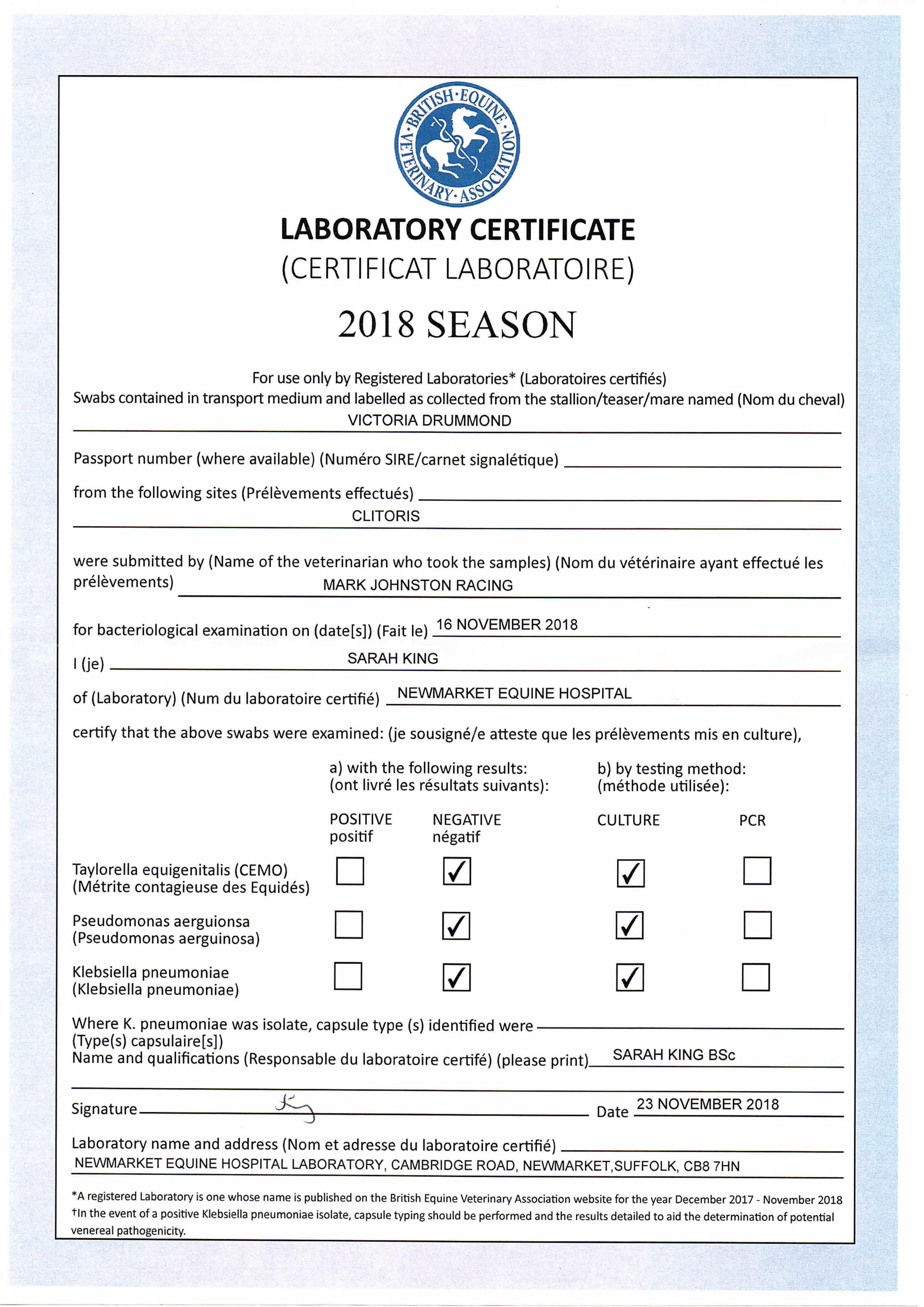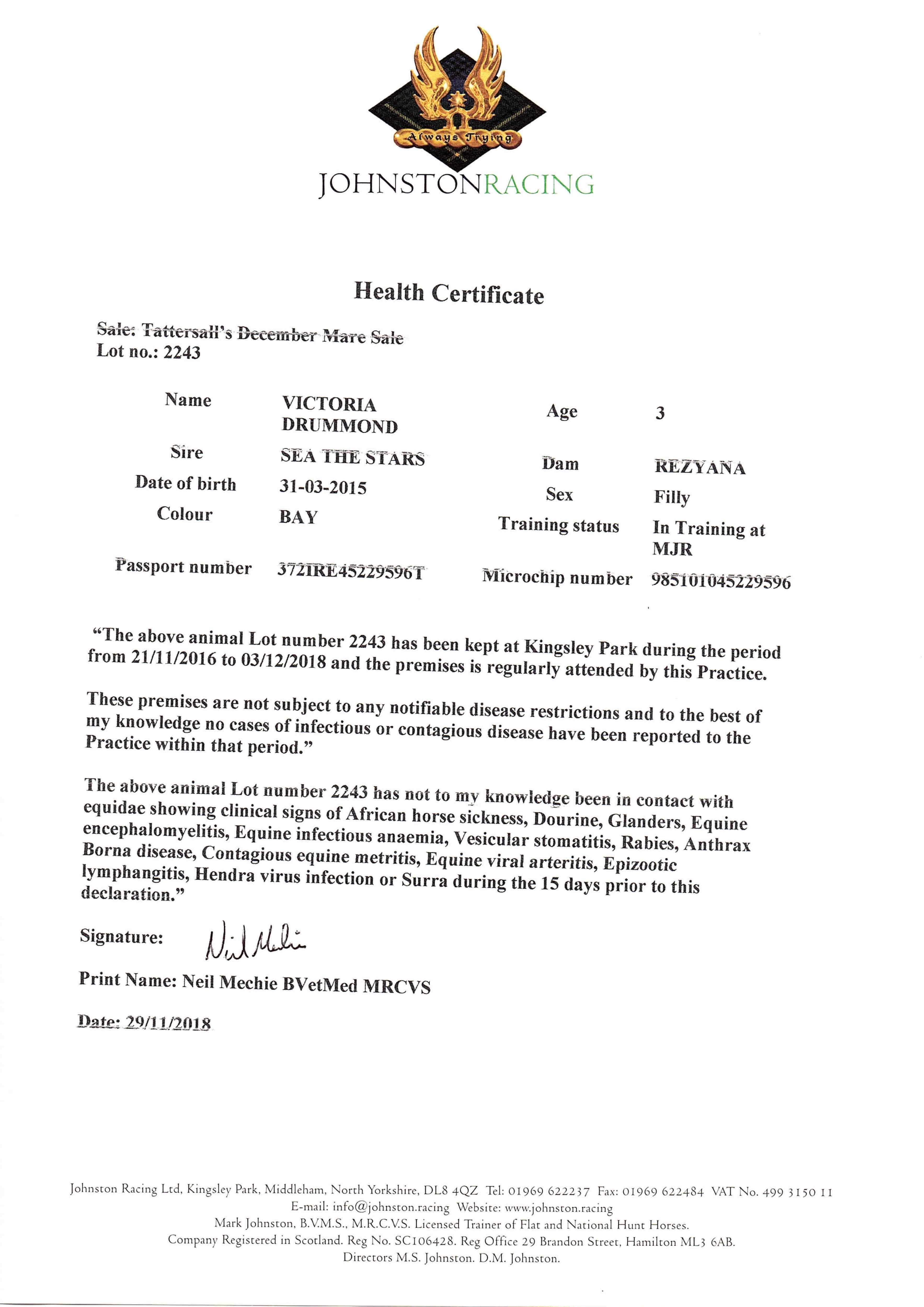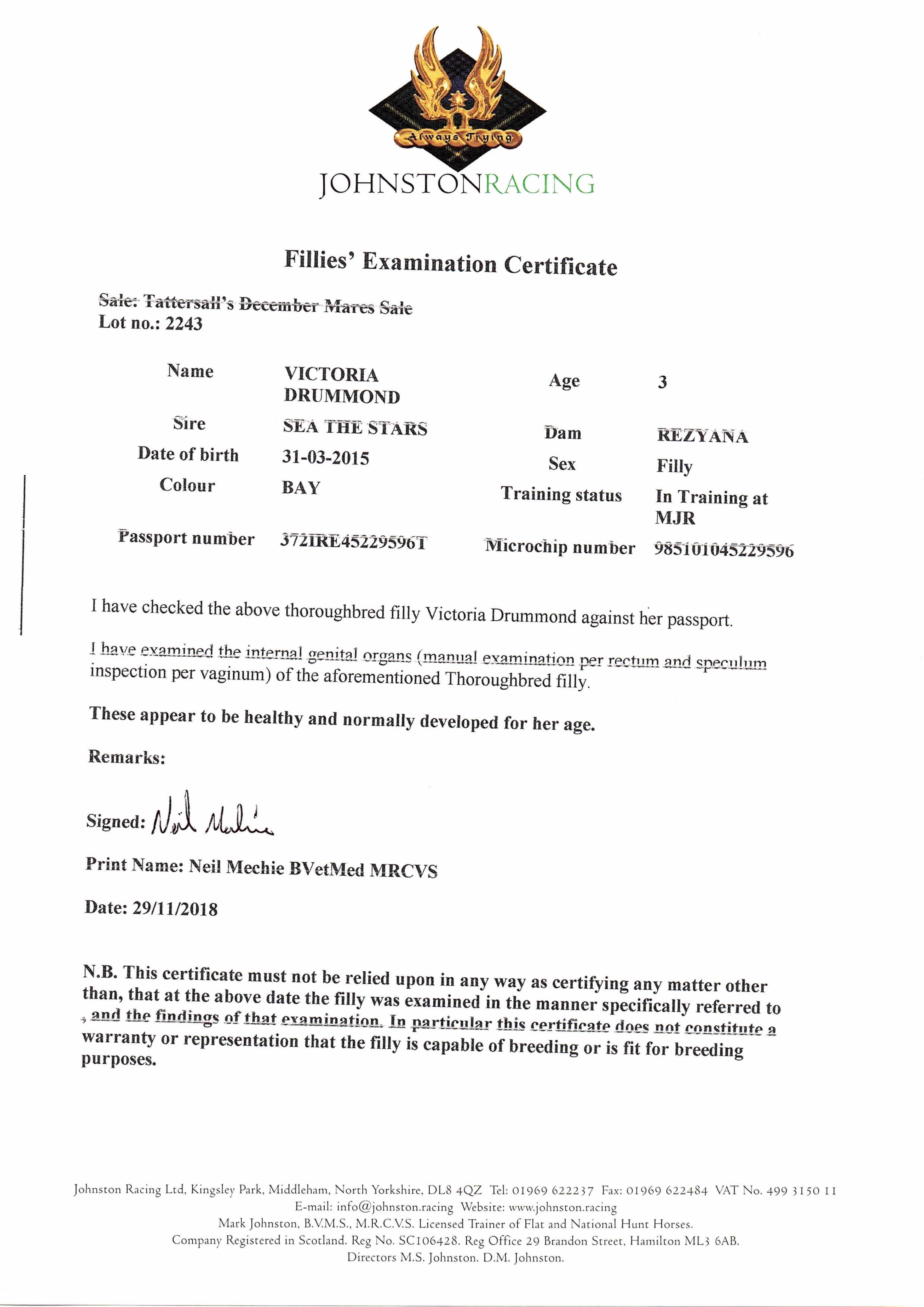 VICTORIA DRUMMOND (IRE), won 2 races at 3 years, 2018 viz 13f. AWT Novice Stakes (Class 5), Chelmsford and 12f. AWT Handicap (Class 4), Southwell and placed twice.