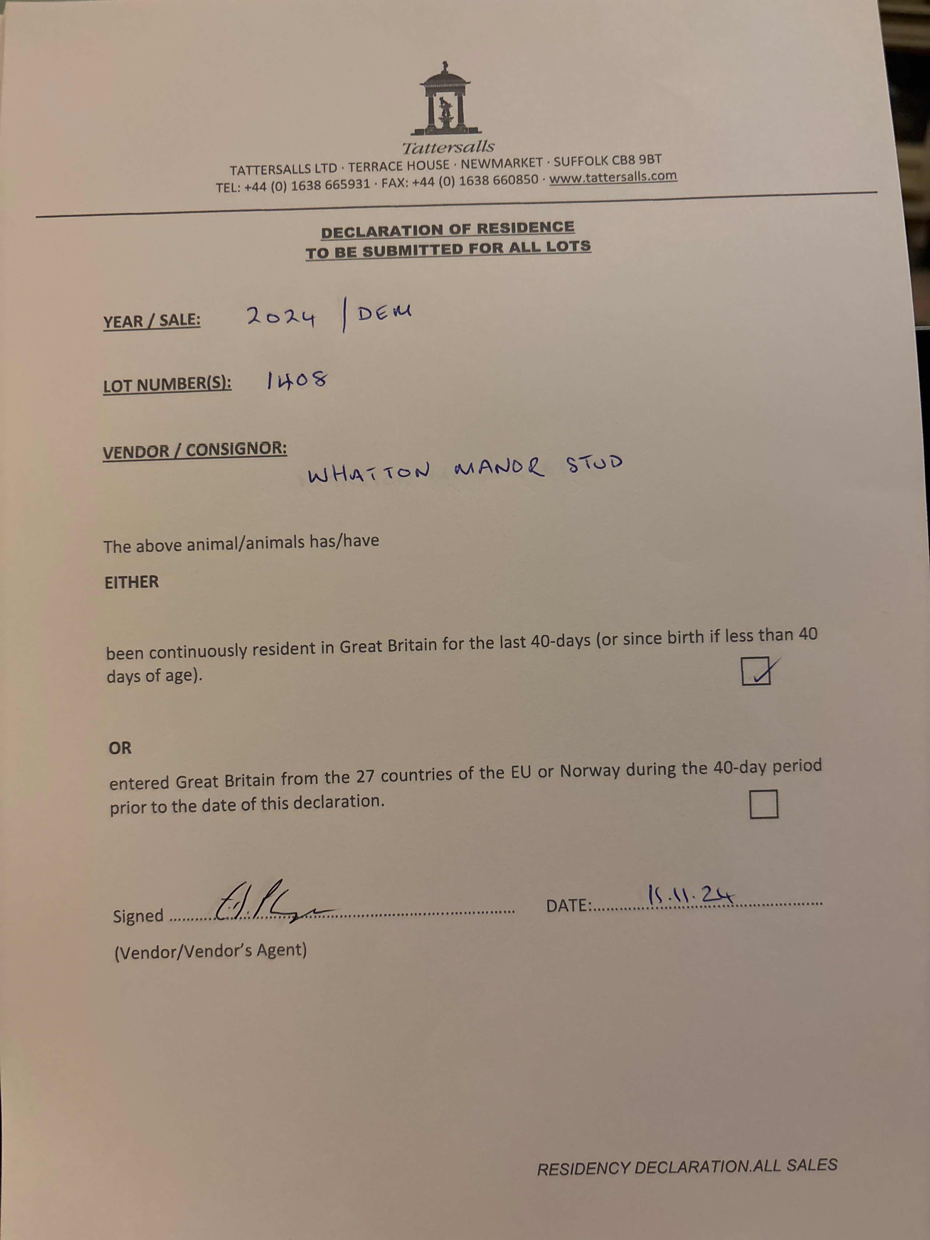 Consignor: Whatton Manor Stud