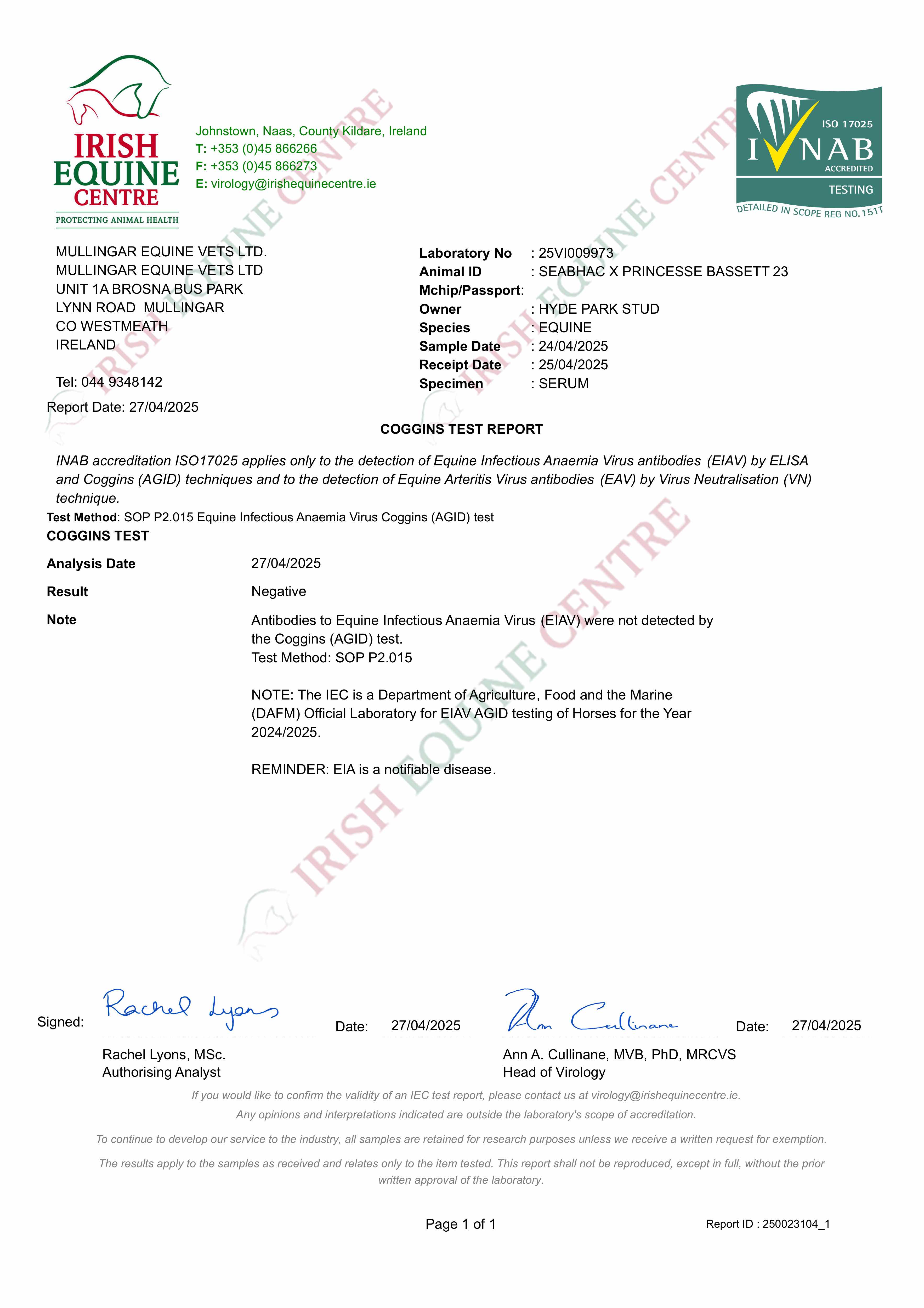 Consignor: Hyde Park Stud, Ireland