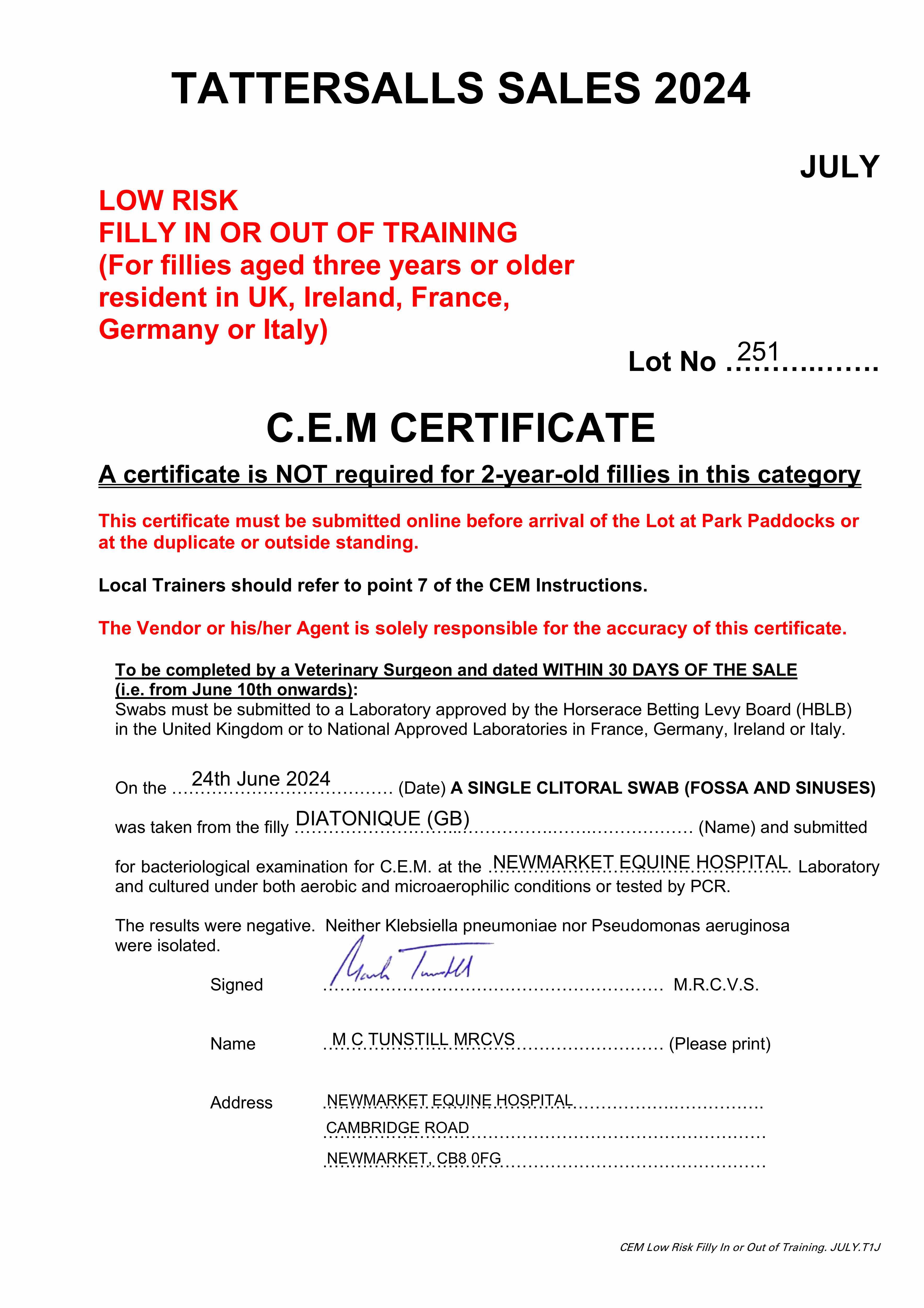 Fillies Examination Cert