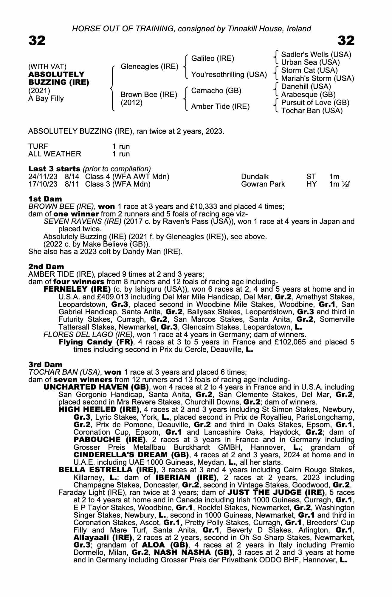 Vendor's Notes: Gleneagles filly sold without reserve as part of syndicate terms and conditions. Lightly raced with only two runs she showed promise on her most recent start at Dundalk.