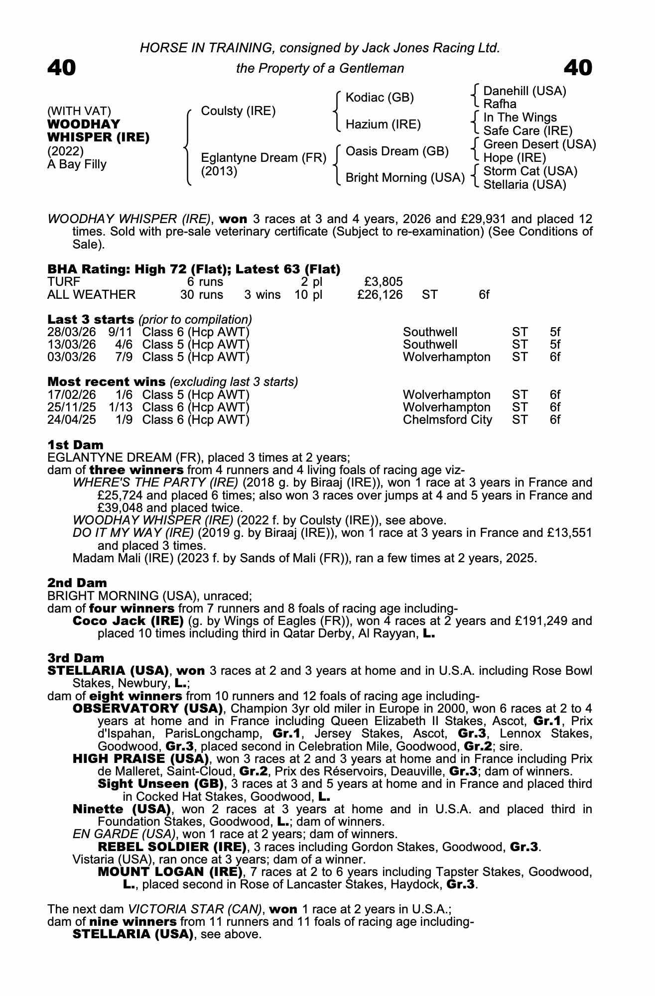 Vendor's Notes: Tough, hard knocking, consistent filly who has run well throughout the winter on the AW. Lots of scope to progress on turf as well as AW.