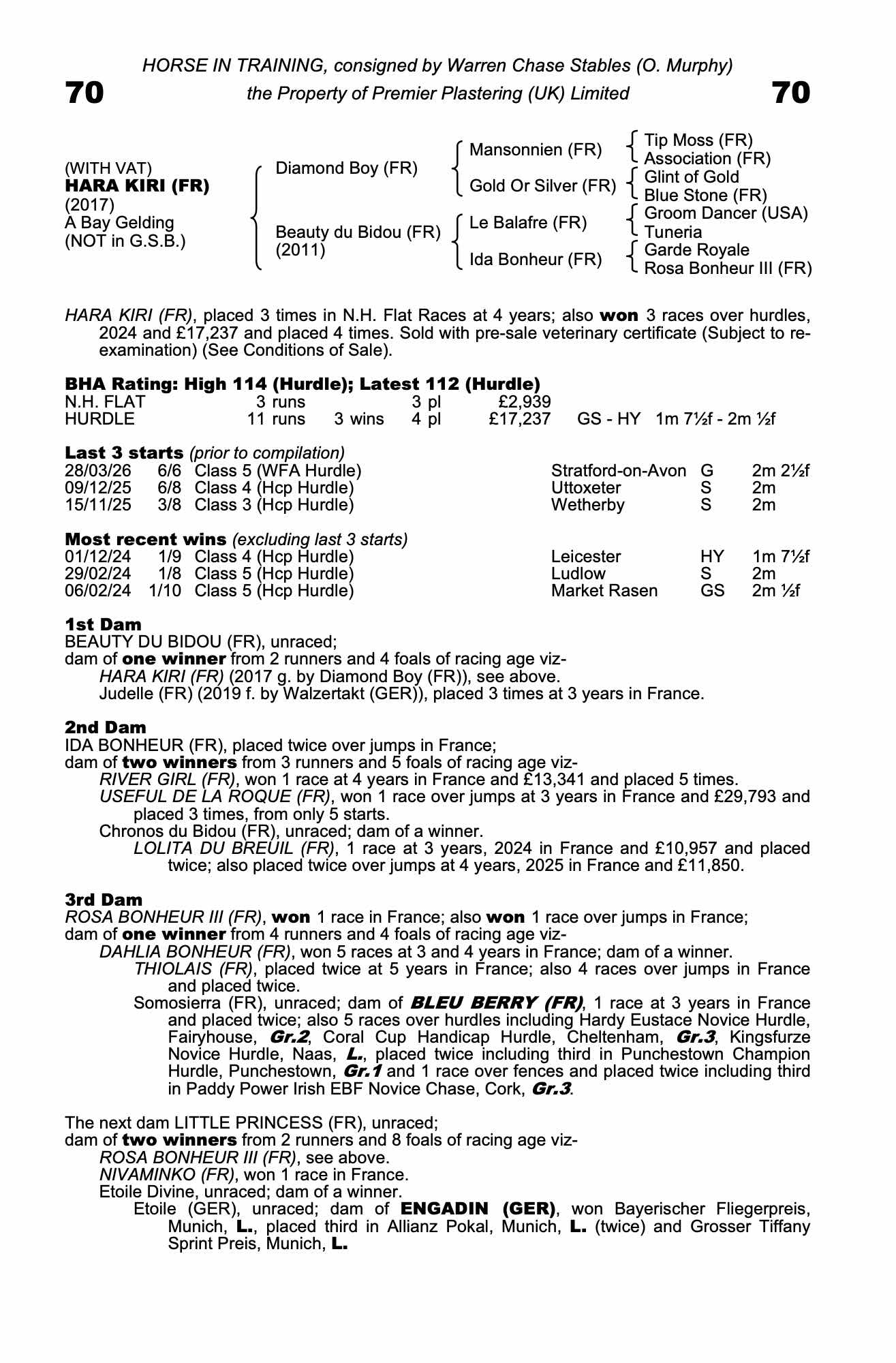 Vendor's Notes: Hara Kiri is a three time winner over hurdles and placed five times under Rules.