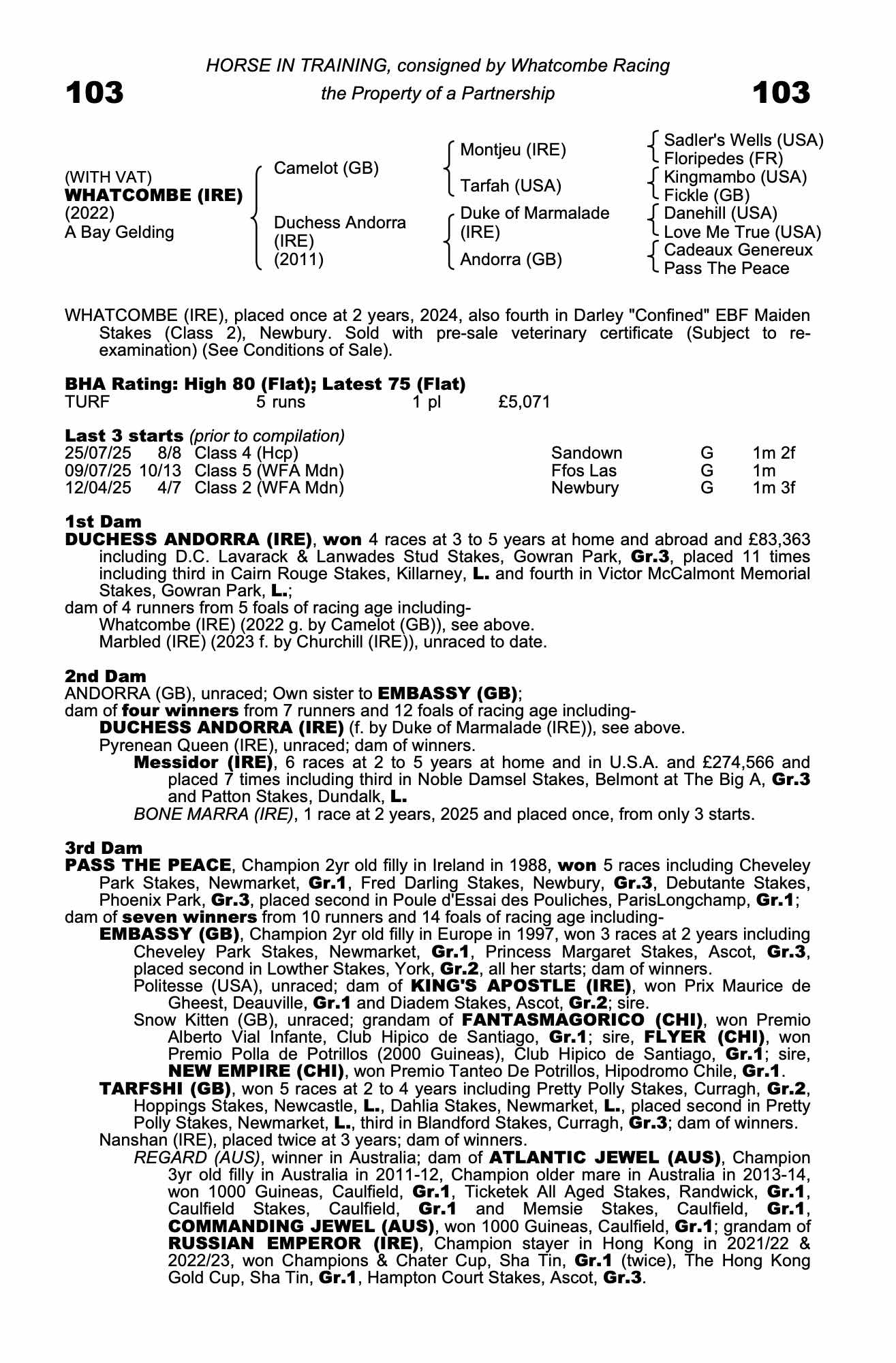 Vendor's Notes: Whatcombe B.G 22 by Camelot out of the Group 3 winning dam Duchess Andorra (7-9f RPR 106); unraced sister to Cheveley Park winner Embassy and half-sister to 1m2f Group 2 winner Tarfshi.