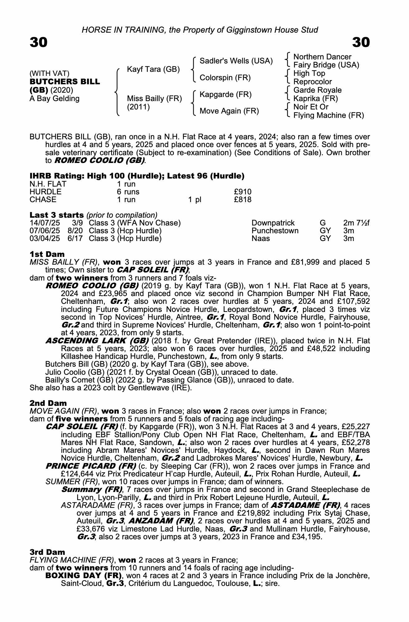 Vendor's Notes: A €265,000 store purchase Butchers Bill is a fine individual by the late great Kayf Tara, he is a half-brother to the high class performers Romeo Coolio and Ascending Lark. A lightly raced sort himself he has only had one start over fences and an encouraging one at that when placed third at Downpatrick last month. He rates a nice type to go on with over the larger obstacles in the UK.