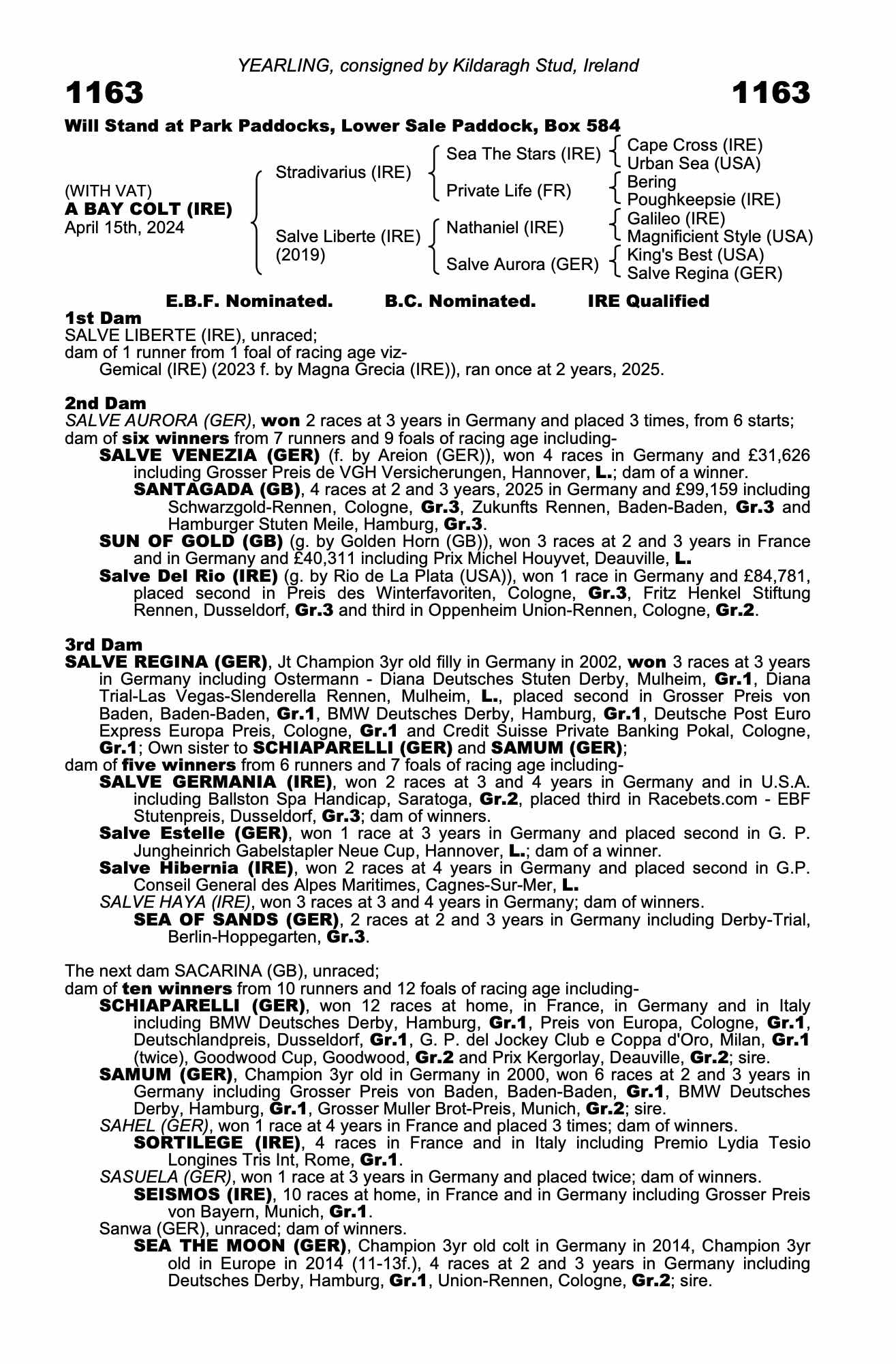Under 2nd dam, SALVE VENEZIA (GER), dam of: SANTAGADA (GB), 5 races at 2 and 3 years, 2025 in Germany and £137,175 including Preis der Deutschen Einheit, Berlin-Hoppegarten, Gr.3.