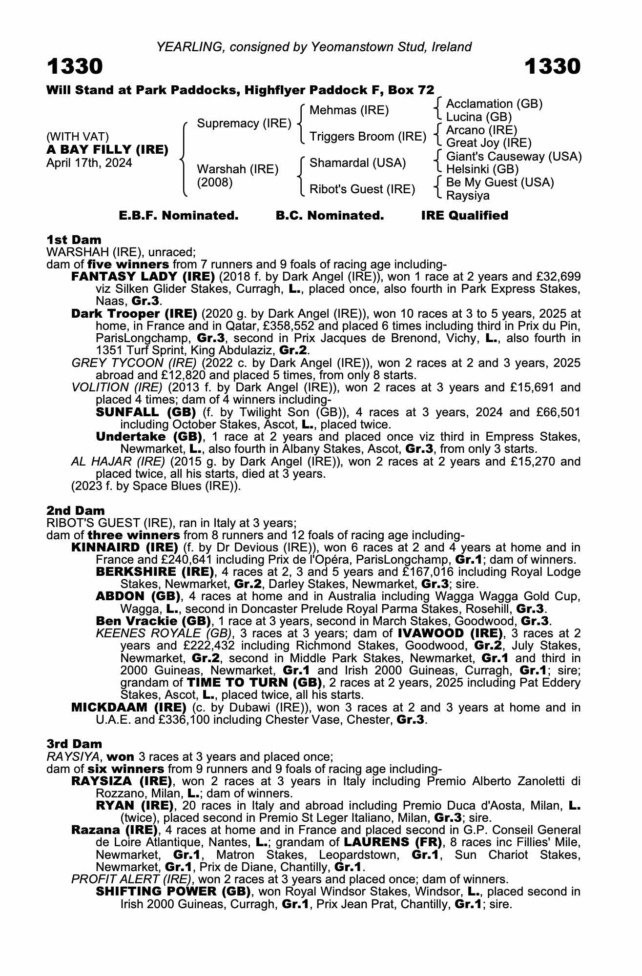 Consignor: Yeomanstown Stud, Ireland