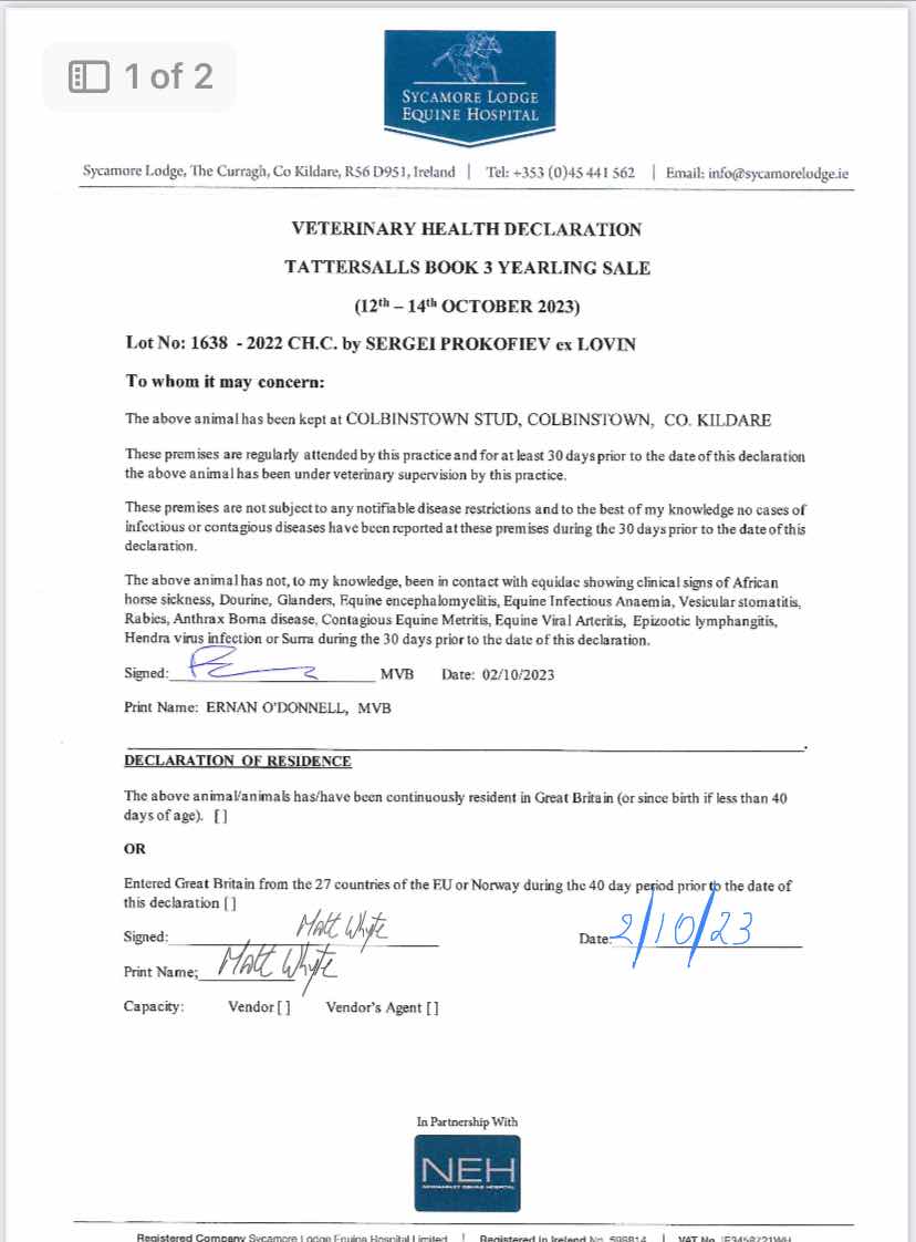 Sapphire Sale 2025 lot 63 F. by Arizona (IRE) 2025, Bayview Stud=>Lot Not Sold €1,400