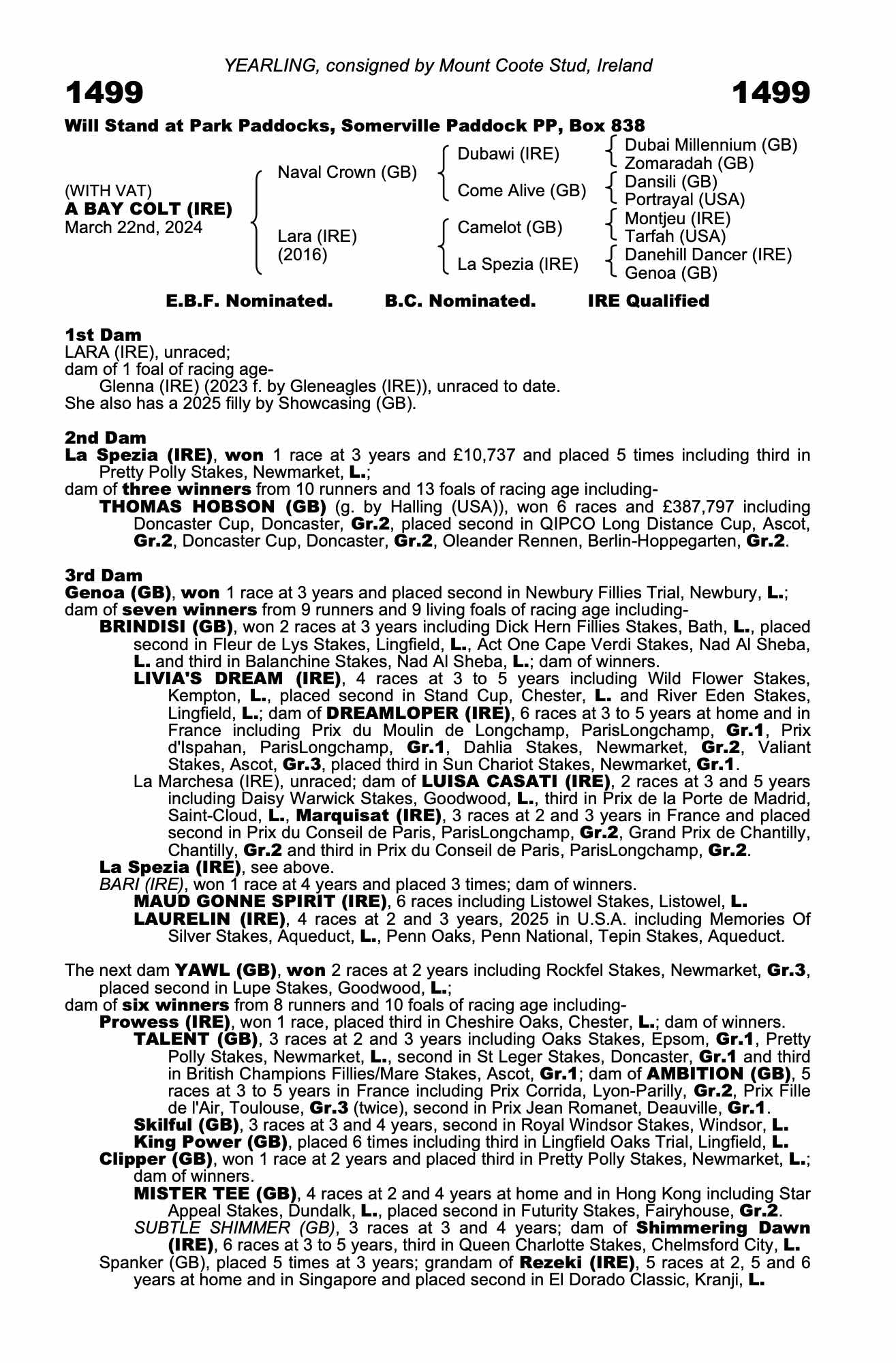 Under 3rd dam, BARI (IRE), dam of: LAURELIN (IRE), 5 races at 2 and 3 years, 2025 in U.S.A. including Saratoga Oaks Invitational Stakes, Saratoga, Gr.2.