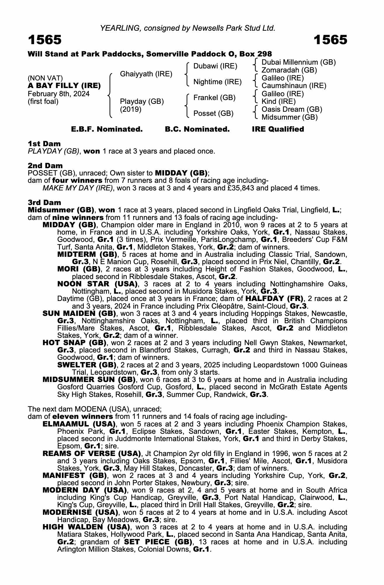 Under 3rd dam, MIDDAY (GB), dam of Daytime (GB): ; dam of NIGHTTIME (FR), 3 races at 2 years, 2025 in France including Prix La Rochette, ParisLongchamp, Gr.3.