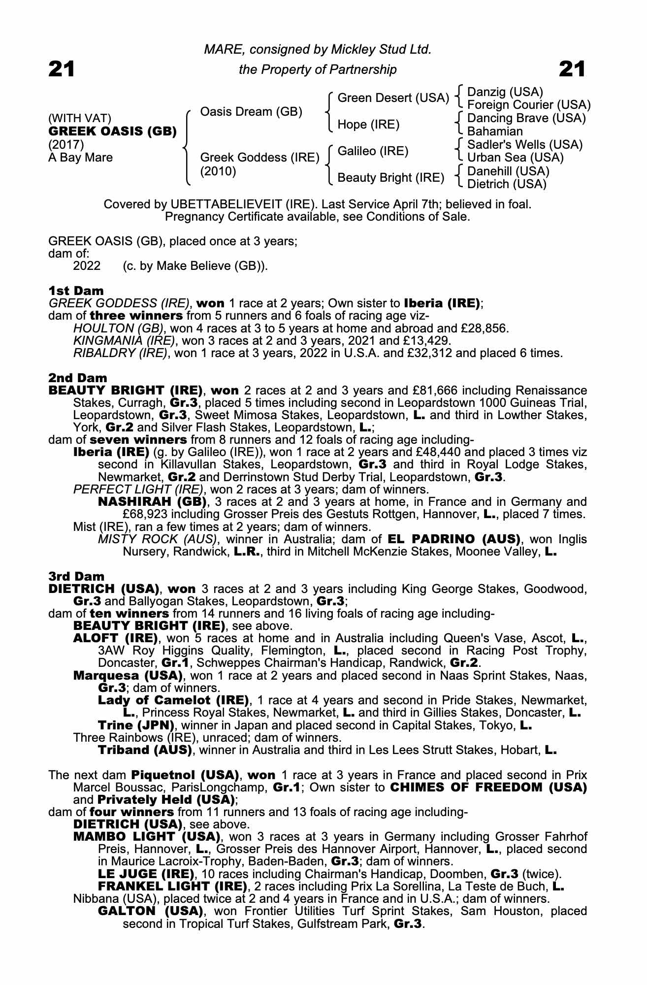 Vendor's Notes: Oasis Dream Mare from the family of Dietrich and Aloft offered in foal to first season sire Ubettabelieveit. Half sister to three winners including Kingmania who ran in the Boadicea Stakes in October and remains in training in 2023.