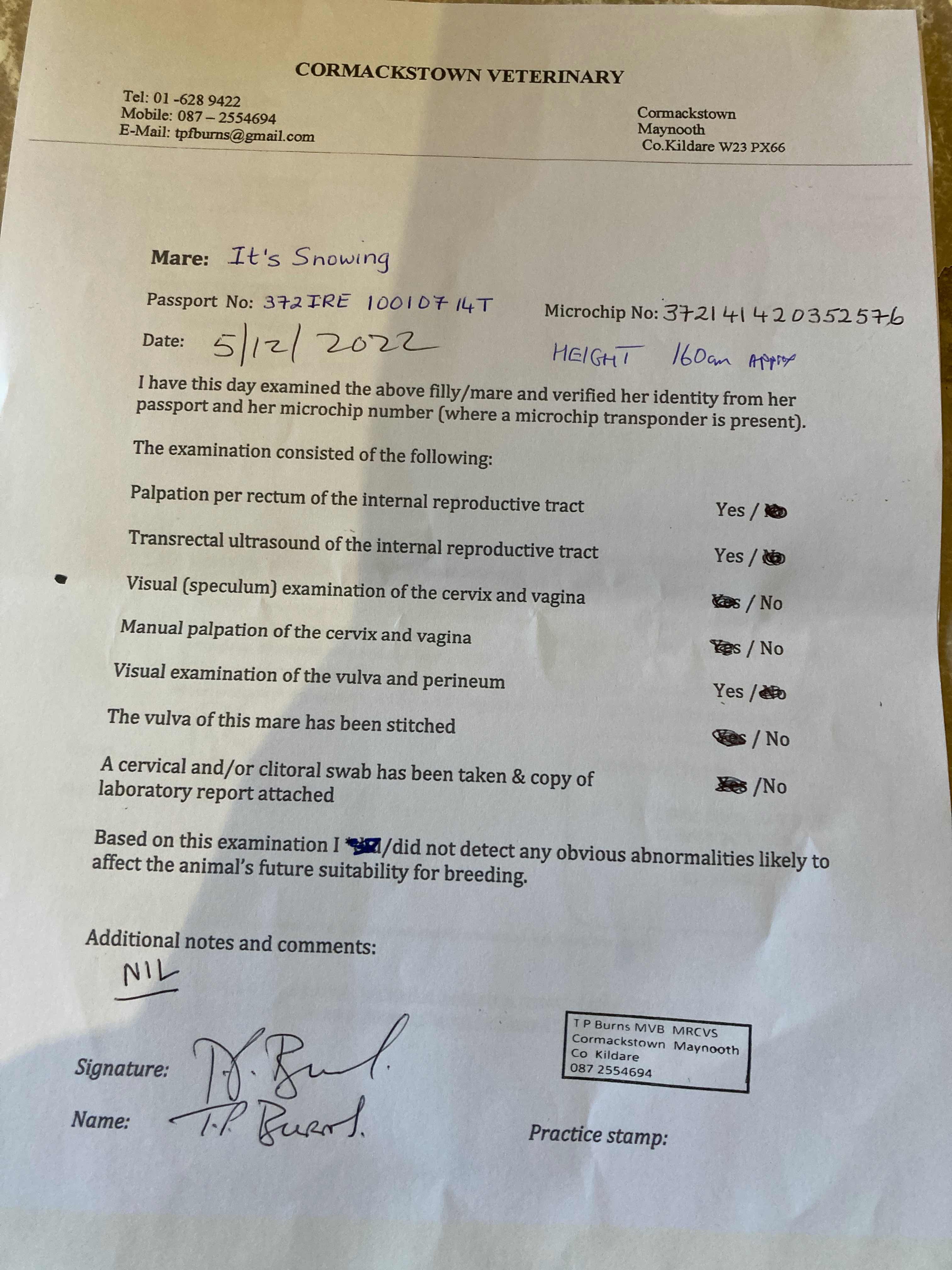Vices/Declarations: Has been seen to Wind-Suck and Crib-Bite.