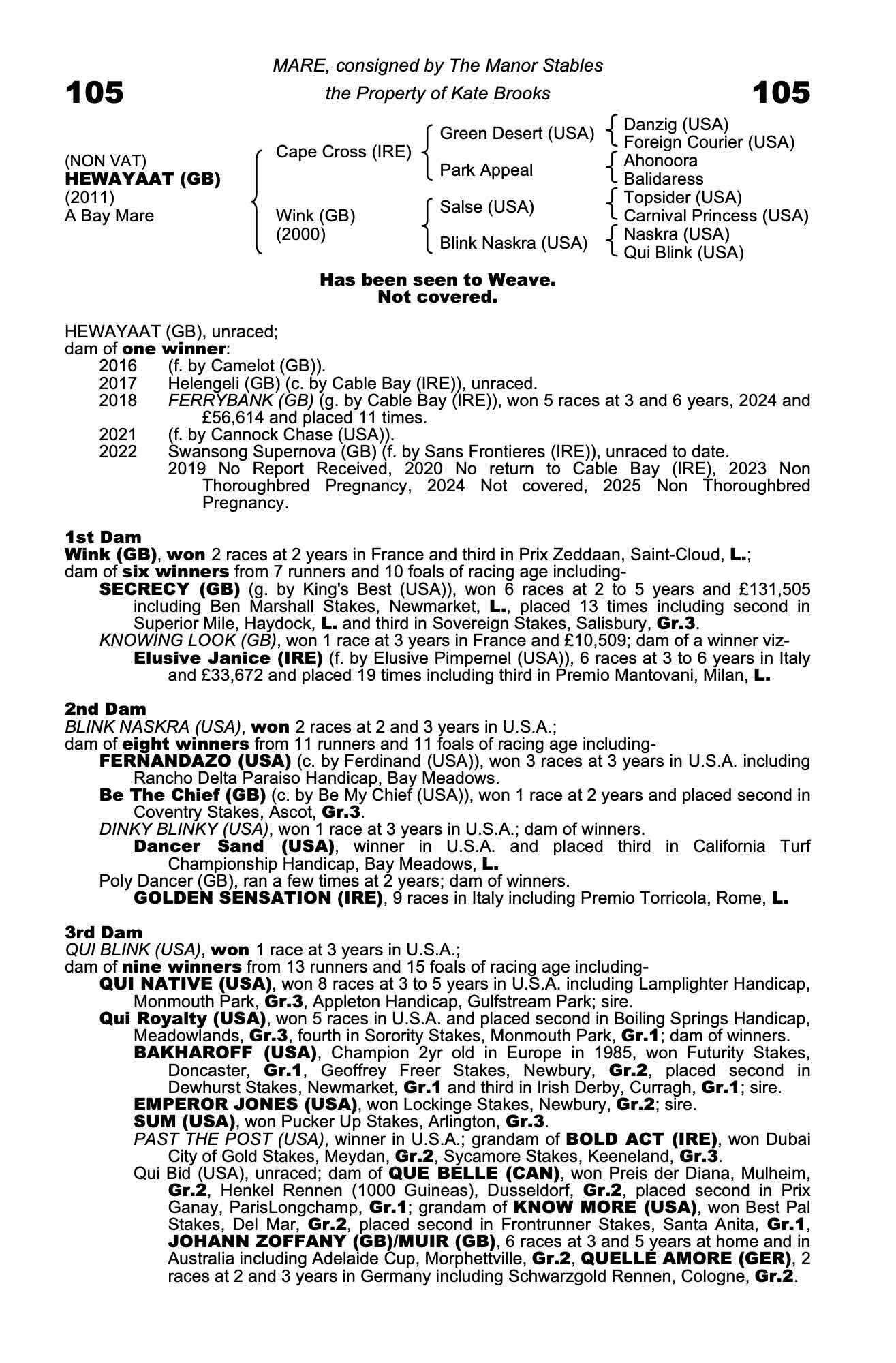 Vendor's Notes: We have owned Hewayaat for the past 4 years, her previous owners Highclere stud breed 2 foals from her, she has breed me 3 lovely foals , she is a very easy mare to handle and is good with the farrier, We have had no complications with foaling, She is a great mum and loves her foals. only for sale as we are no longer breeding. She has taken 1st time to each covering with me.