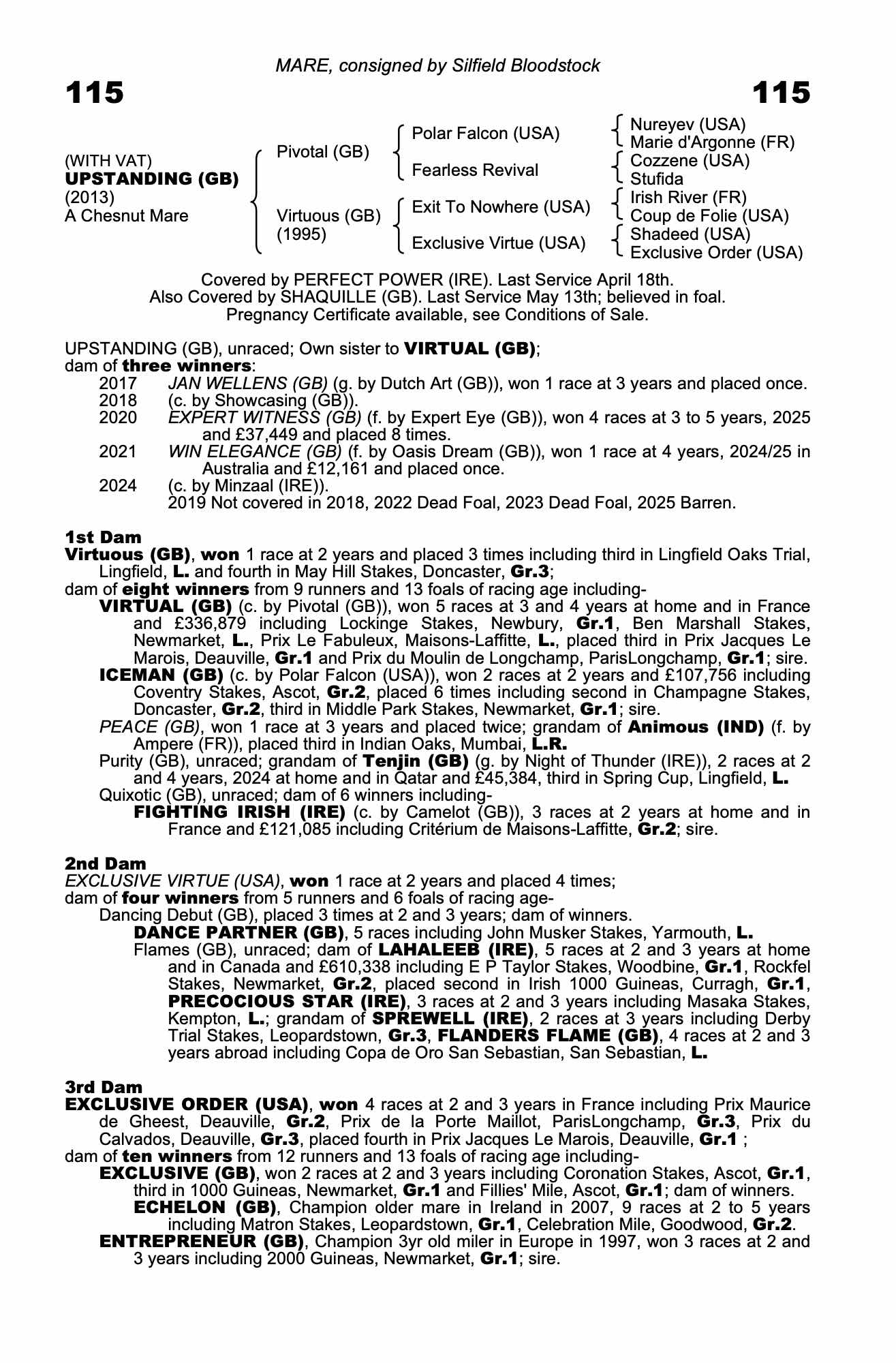 Vendor's Notes: Chestnut Mare by the outstanding broodmare sire Pivotal and in foal to Shaquille whose first foals have been so well received. A FULL sister to the group one winner Virtual and dam of two winners.