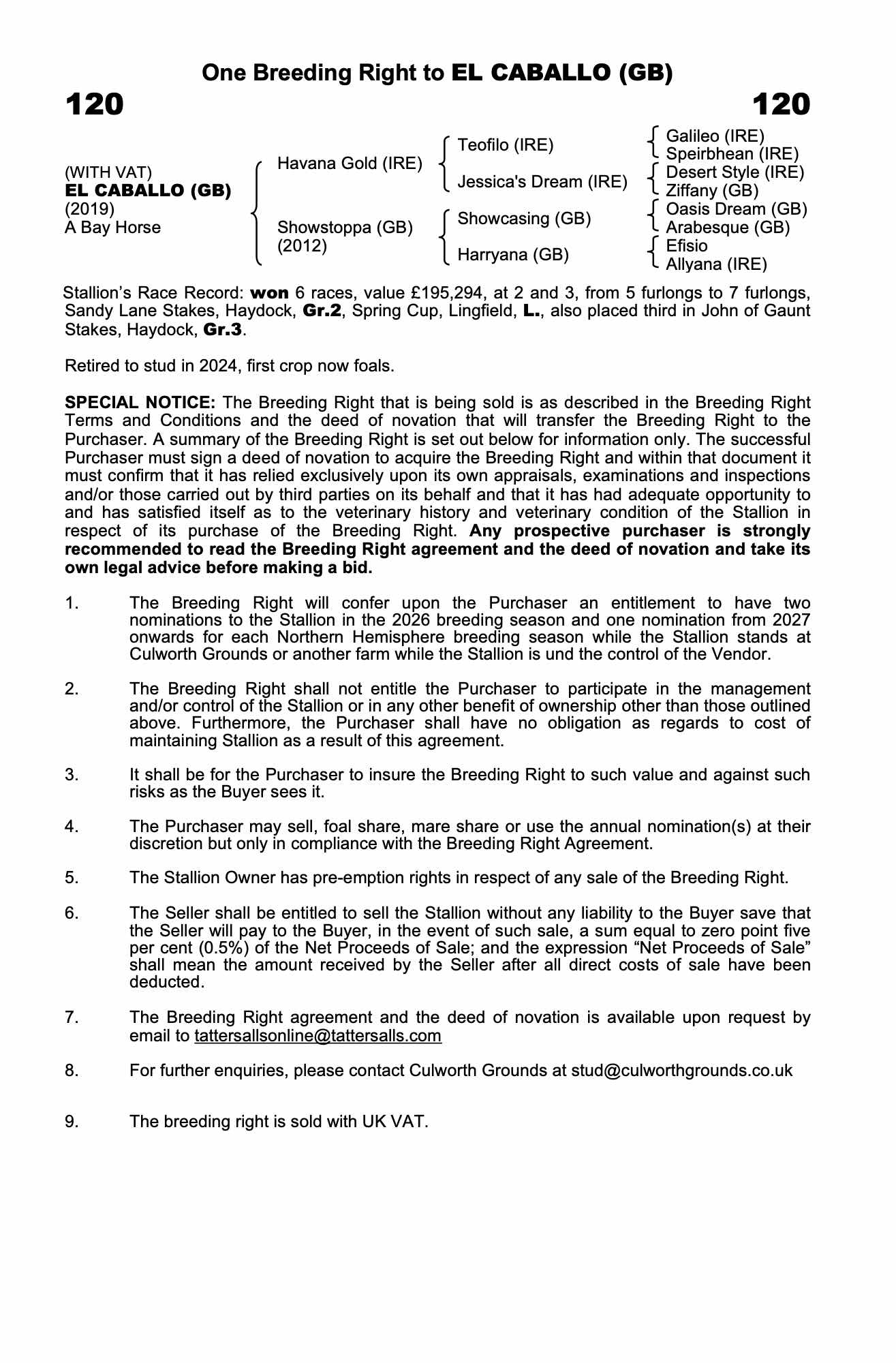 Vendor's Notes: The Breeding Right agreement and the deed of novation is available upon request by email to tattersallsonline@tattersalls.com.