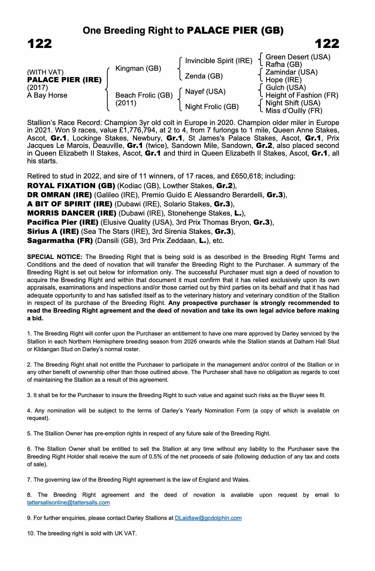 Vendor's Notes: The Breeding Right agreement and the deed of novation is available upon request by email to tattersallsonline@tattersalls.com.