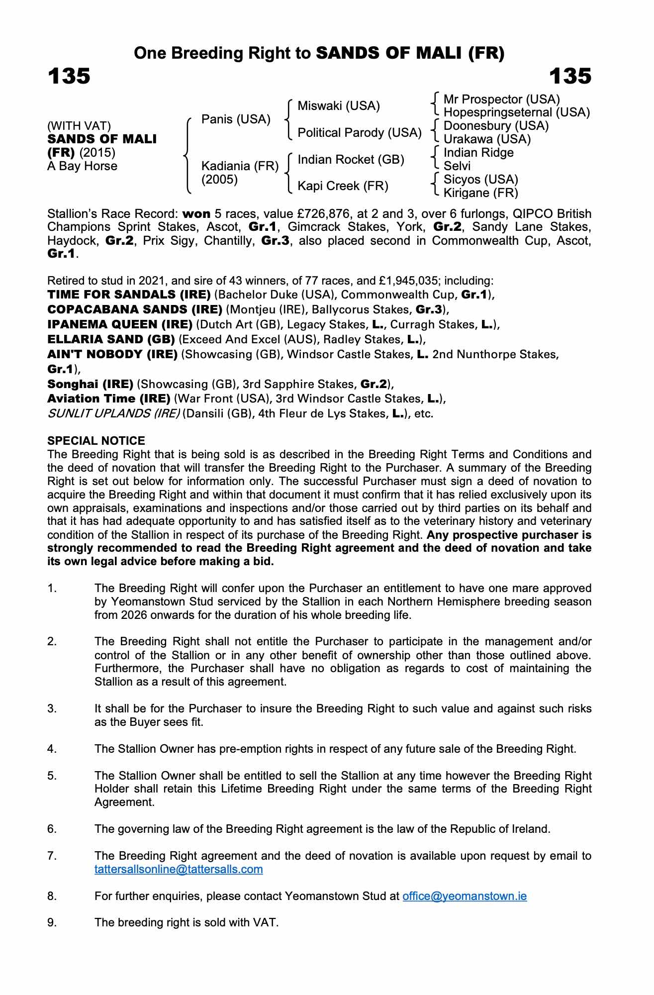 Vendor's Notes: 1 Lifetime Breeding Right to Sands of Mali