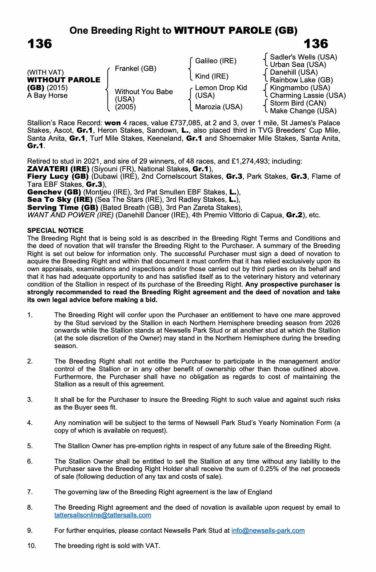 Vendor's Notes: The Breeding Right agreement and the deed of novation is available upon request by email to tattersallsonline@tattersalls.com.