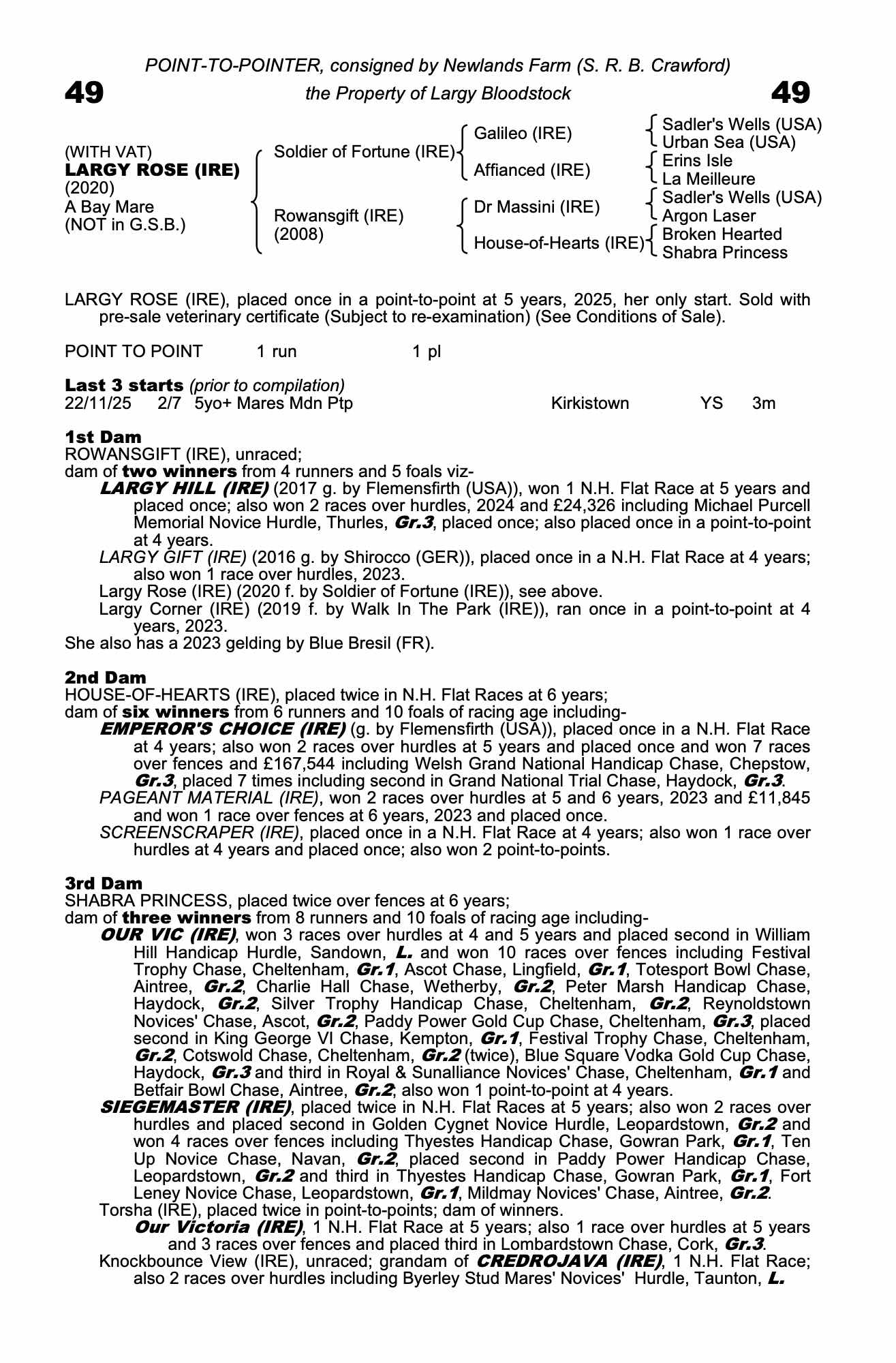 Vendor's Notes: Largy Rose made a promising debut to be narrowly beaten by a more experienced rival. On the evidence of this effort she should be the one to beat on her next time out. A career under rules no doubt beckons for this half sister to graded winner Largy Hill.