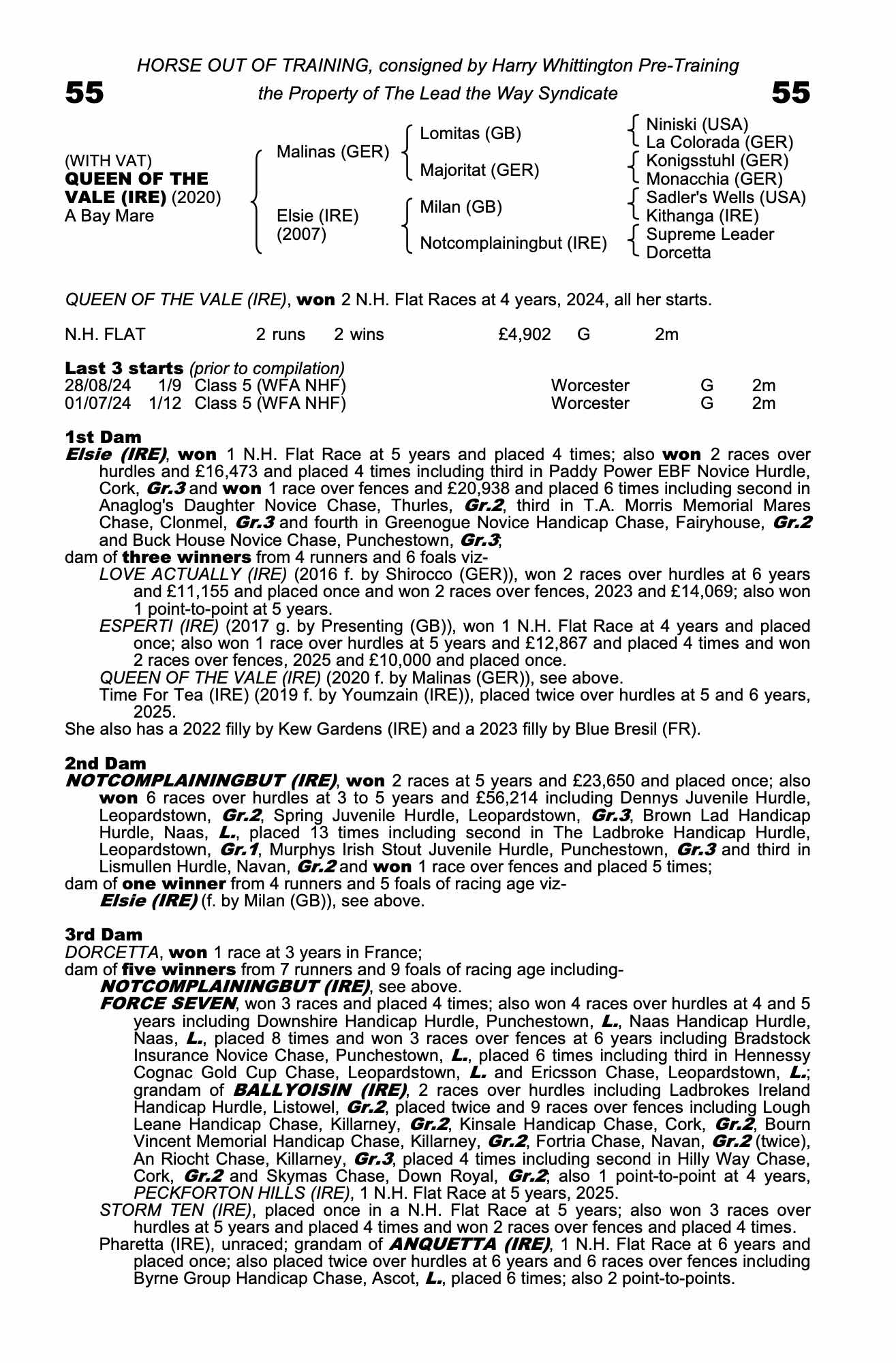 Vendor's Notes: Due to two very minor tendon lesions 12 months apart, this talented dual bumper winner is being sold as a broodmare prospect. Being out of a black type Milan Mare who is 3 from 4 with her progeny she is very much bred for the job. She won both her two starts impressively from the front, showing both plenty of speed and stamina. She was being prepared for the listed Mares bumper at Cheltenham in November 24 when the initial injury ruled her out. She has no vices and has a very good temperament to handle.
