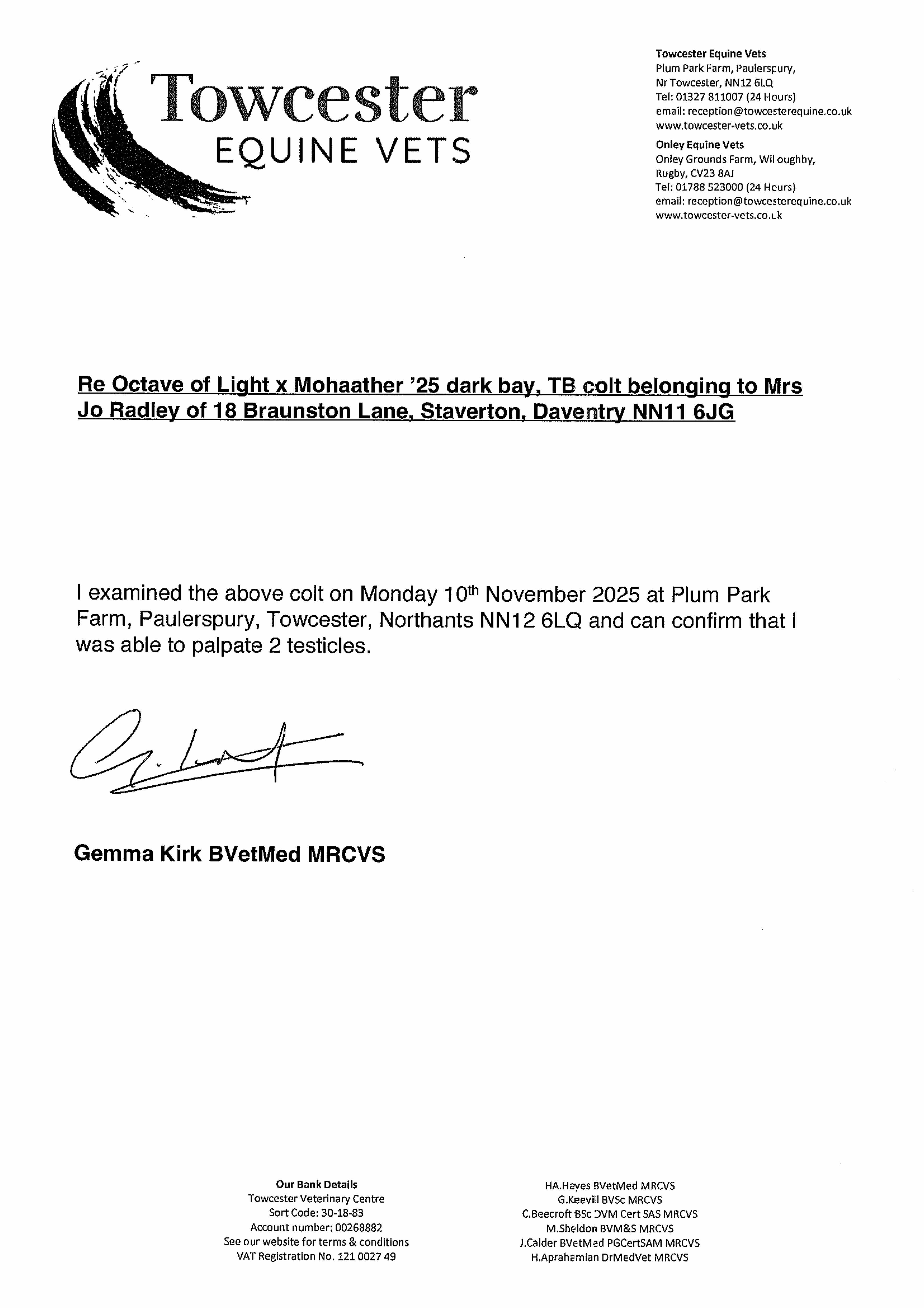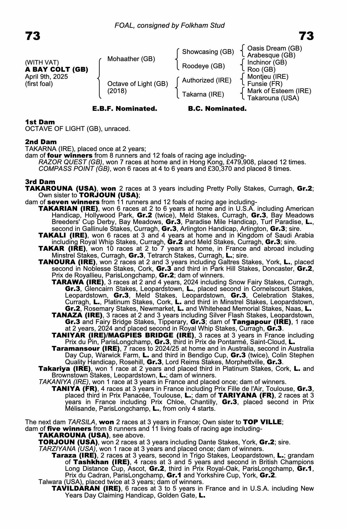 Vendor's Notes: A lovely, correct, good walking foal, with a great mind and good bone. His dam Octave of Light by the Derby winner, AUTHORIZED, was un-raced due to Covid but was tested as having grade 1 wind and showed ability. She is from the deep Aga Khan Stud family of TOP VILLE, French Derby Winner and TARAWA who was 4th in the GR1 Irish 1000 Guineas and the mating was designed by a professional pedigree consultant. His sire MOHAATHER the outstanding GR1 SUSSEX STAKES winner, is also the sire of recent GR1 Winner BIG MOJO. The colt’s video scope and x-rays are excellent.