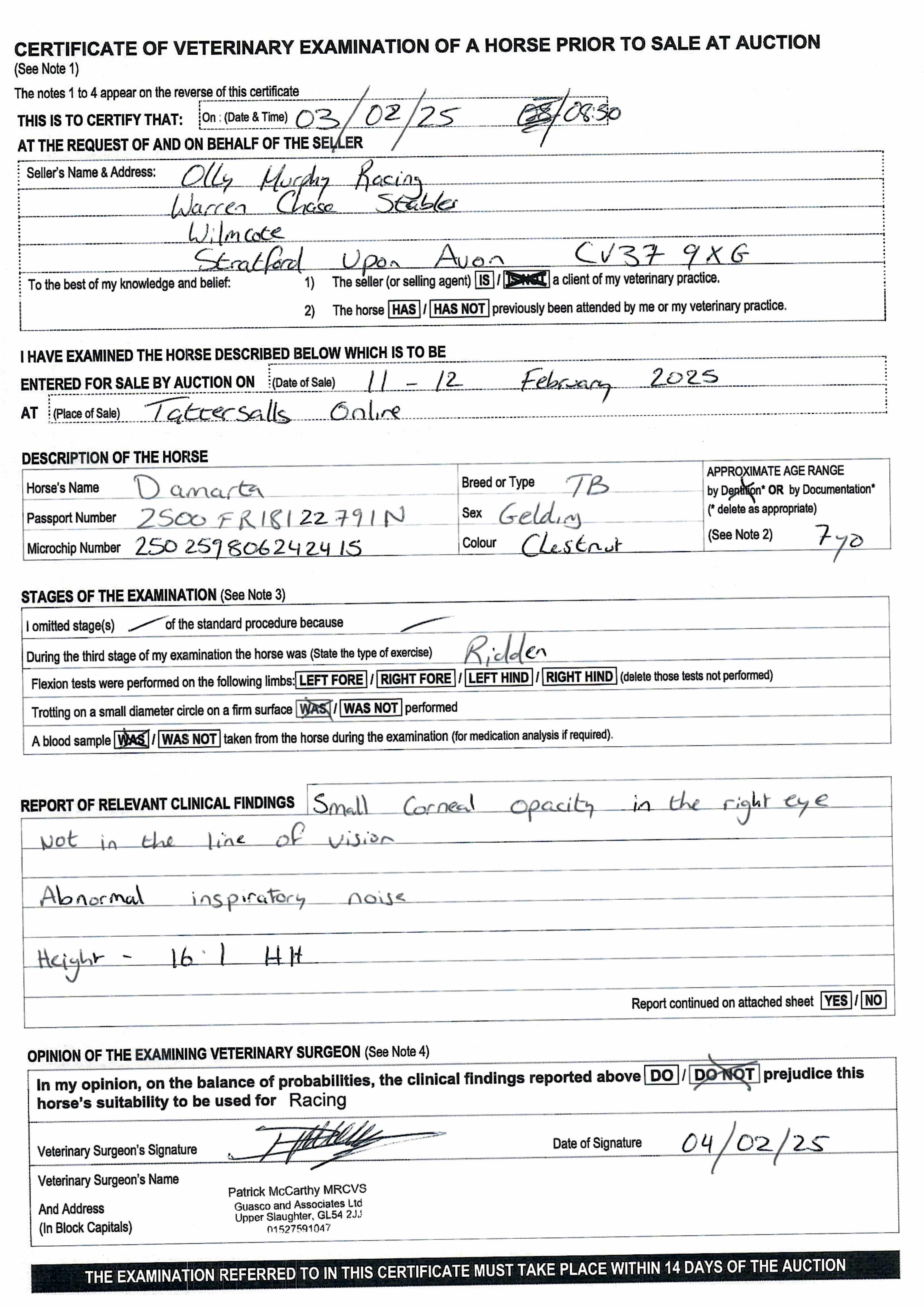 Tuesday 11 February:  Has run since publication of catalogue. 10/02/25 - finished 5th of 7 in 2m (Class 4) Handicap hurdle at Catterick.
