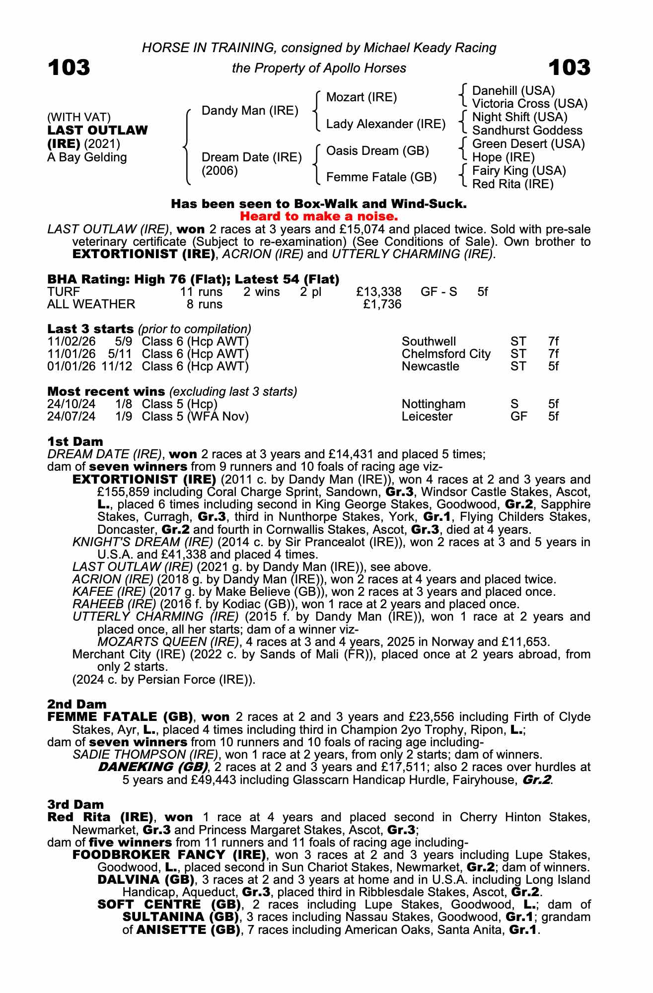 Vendor's Notes: Sound horse who is fit and well and has been running recently on the all-weather.