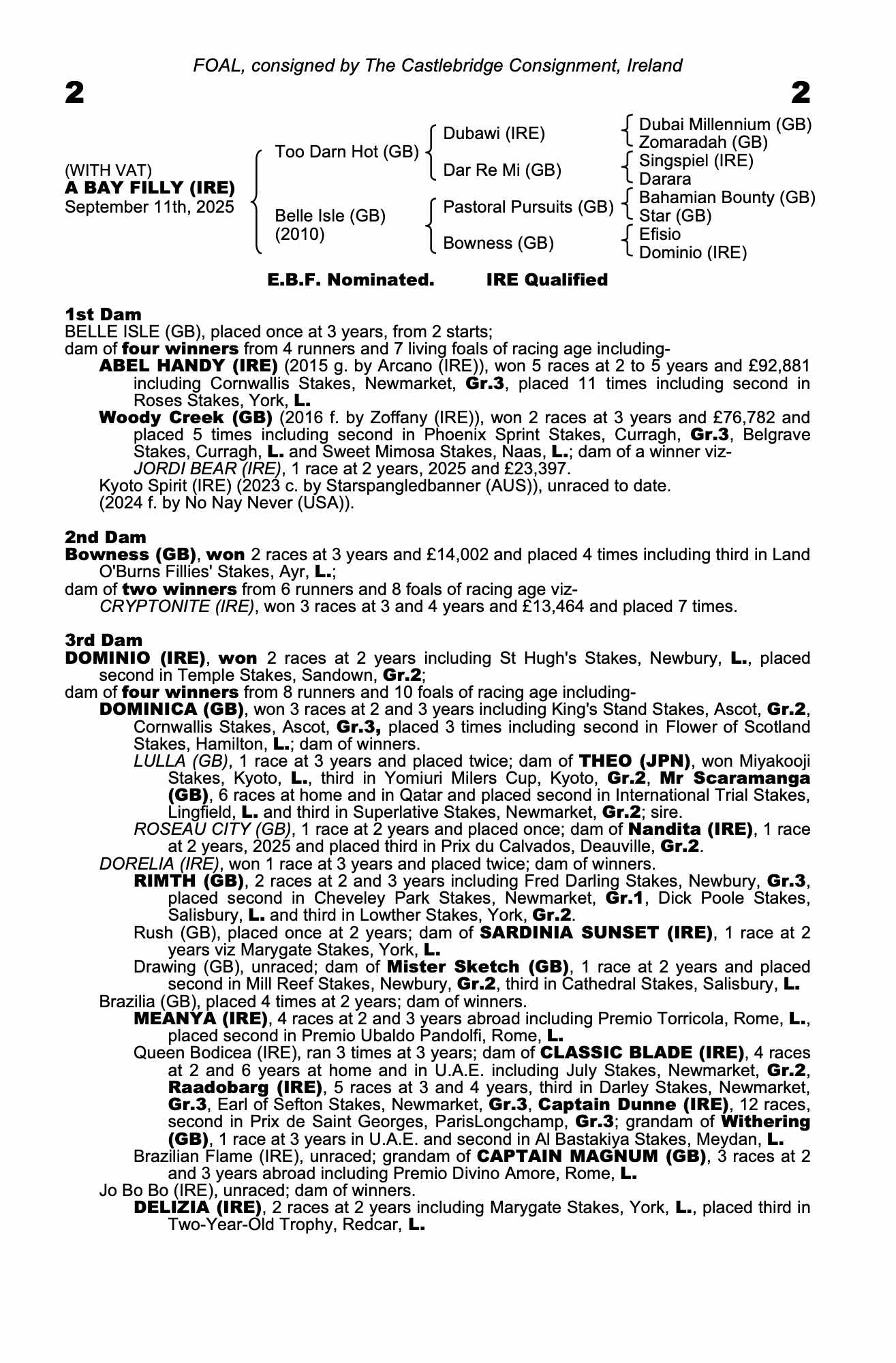 She is a half-sister to four runners, all of whom are winners including Group 3 Cornwallis Stakes winner ABEL HANDY and Group 3 placed WOODY CREEK. It is the family of speedy Royal Ascot Kings Stand Stakes winner and Nunthorpe Stakes placed DOMINICA.