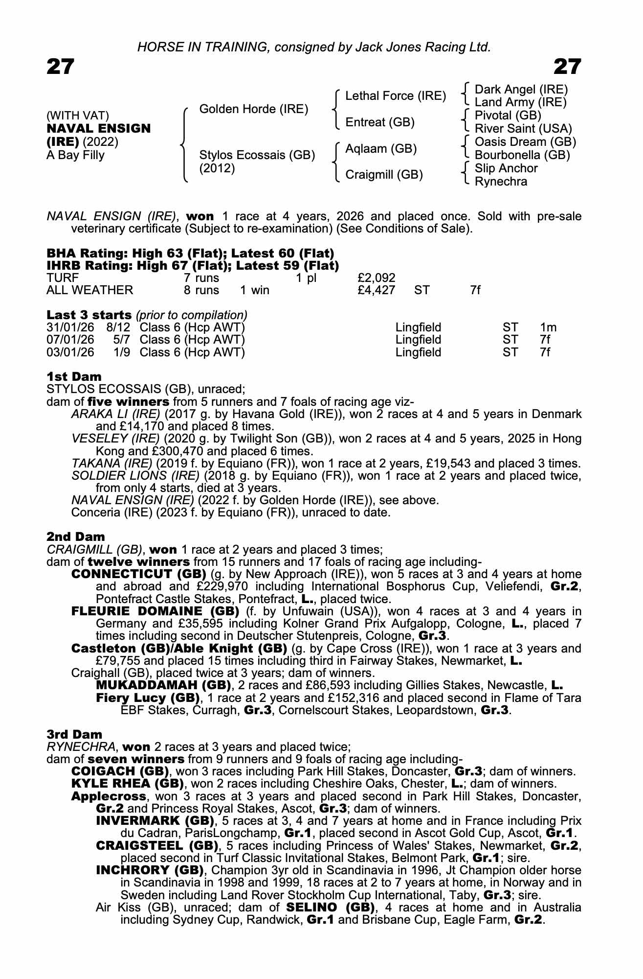 Vendor's Notes: Scopey, athletic filly. Recent Lingfield AW winner. Lightly raced. Lots of potential moving forward on both AW and turf.