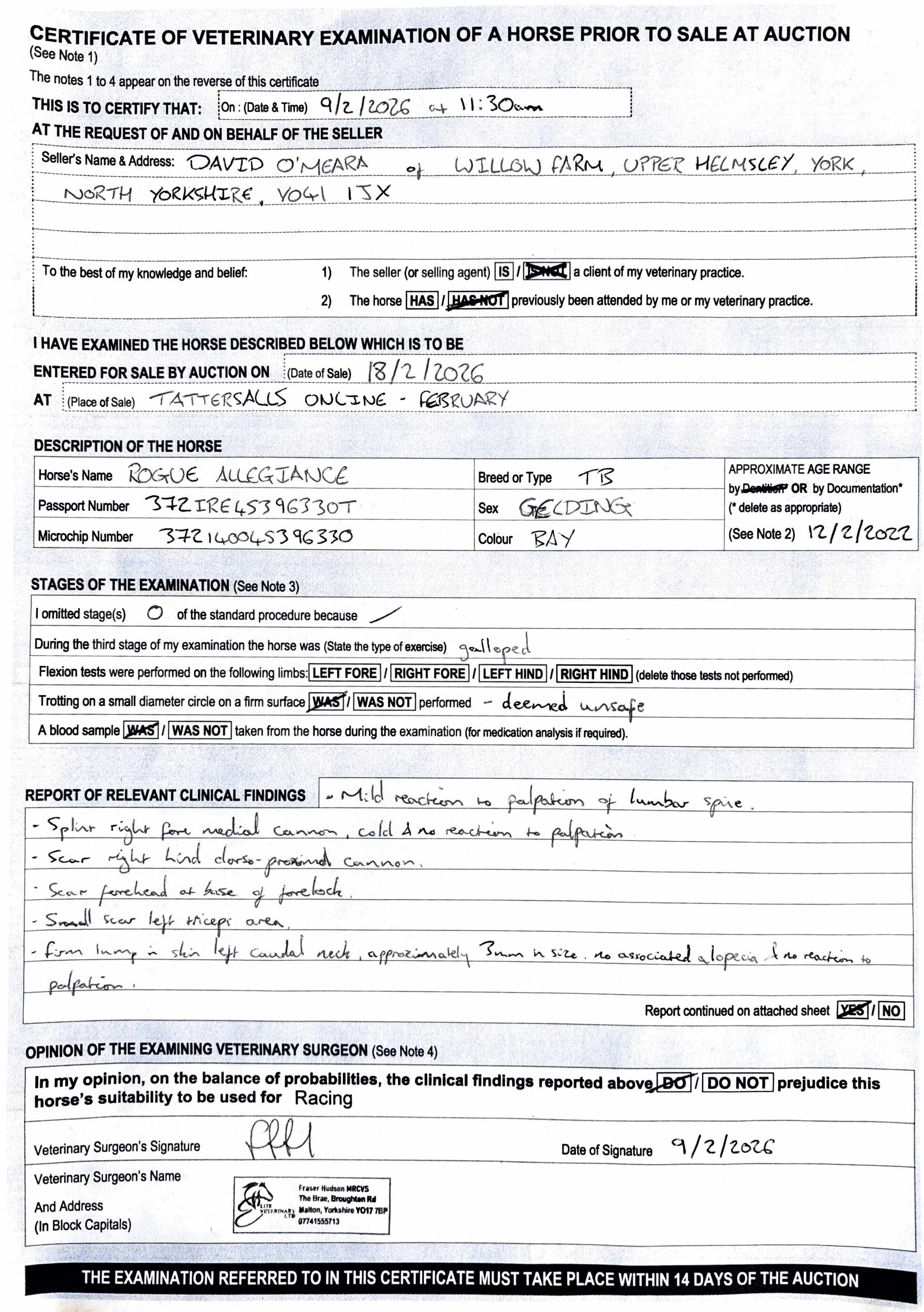 Vices/Declarations: Has had a hobday operation.