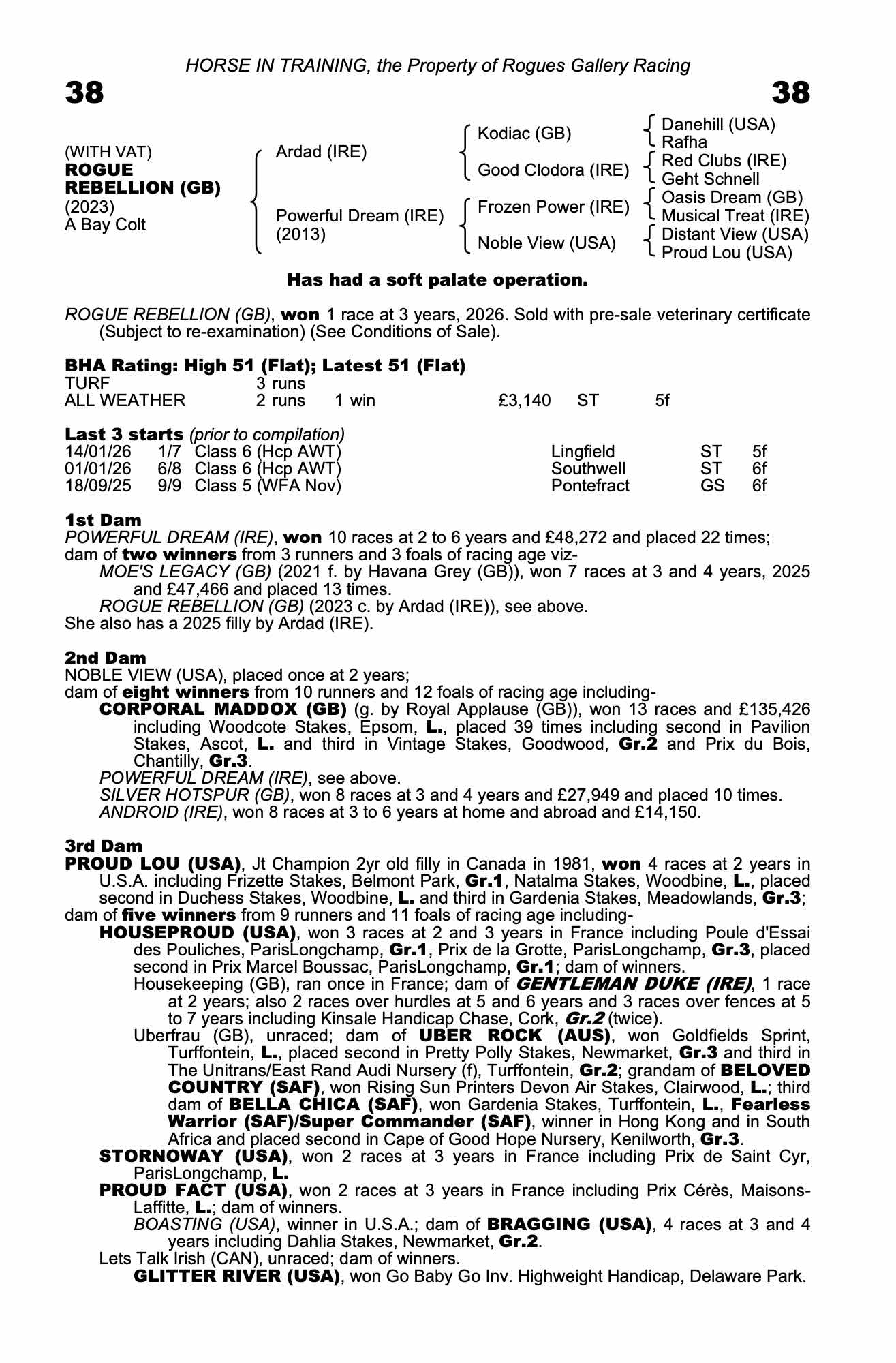 Vices/Declarations: Has had a soft palate operation. No valid EIA Coggins received.