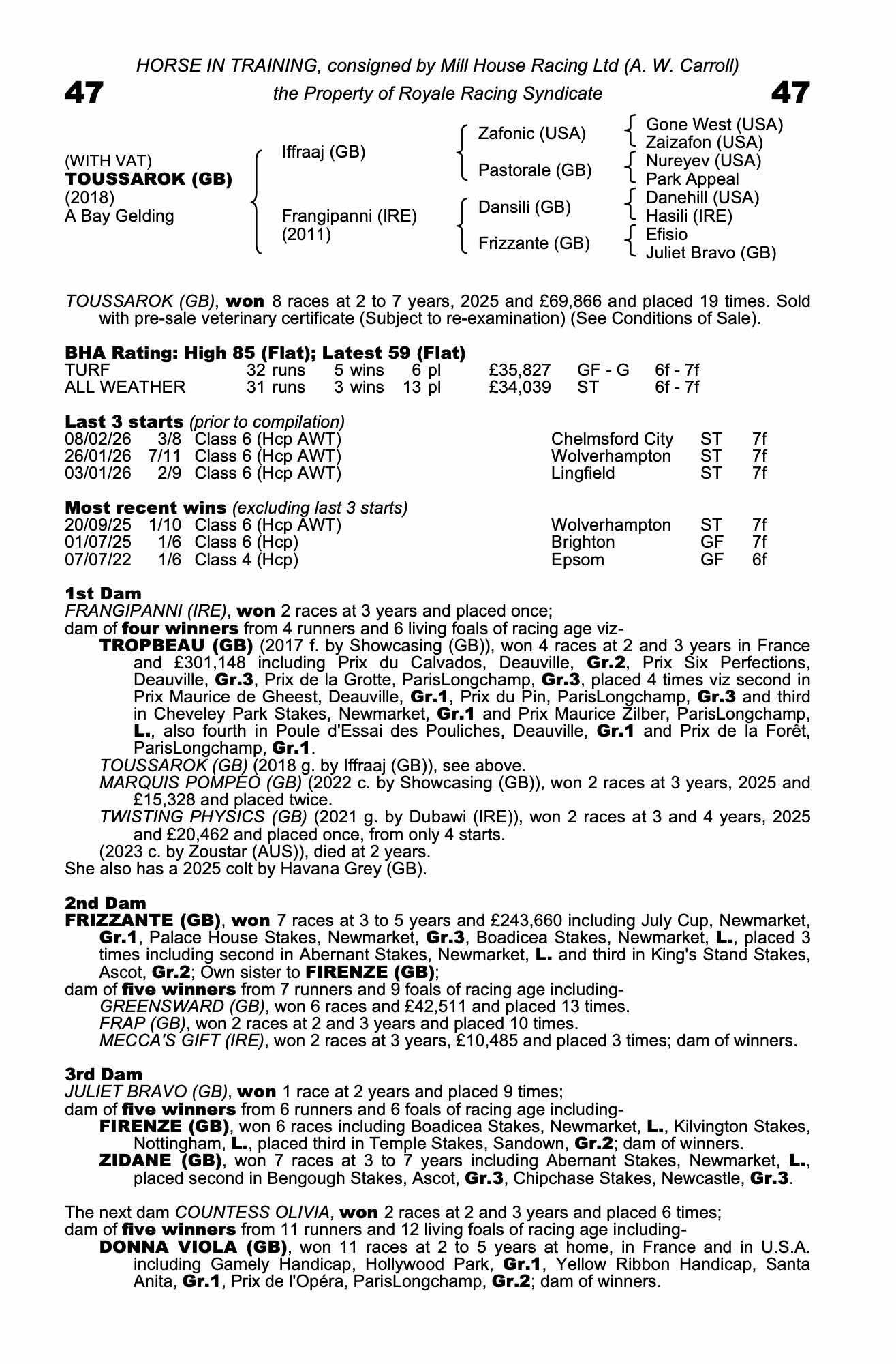 Vendor's Notes: 8 year old gelding. Winner of 8 races, tough and consistent gelding on both All Weather and turf over 6 and 7 furlongs. Well handicapped on old form.