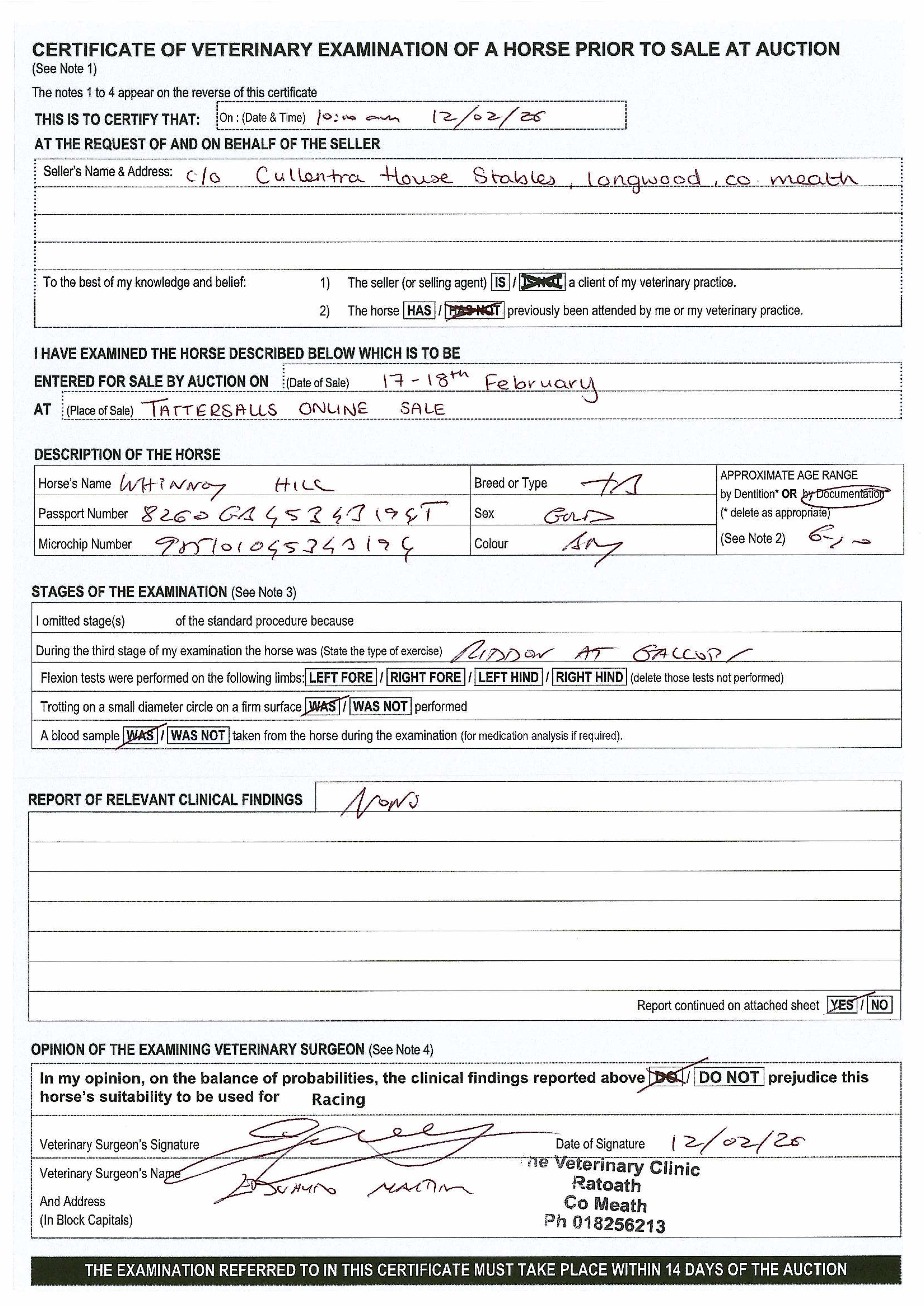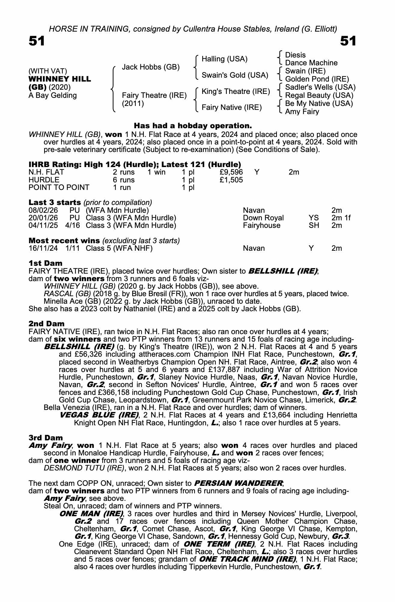 Vendor's Notes: Whinney Hill is a bumper winner who still hold his maiden tag over hurdles. He is relatively lightly raced and could be open to improvement. He was also placed in a point to point as a 4yo.