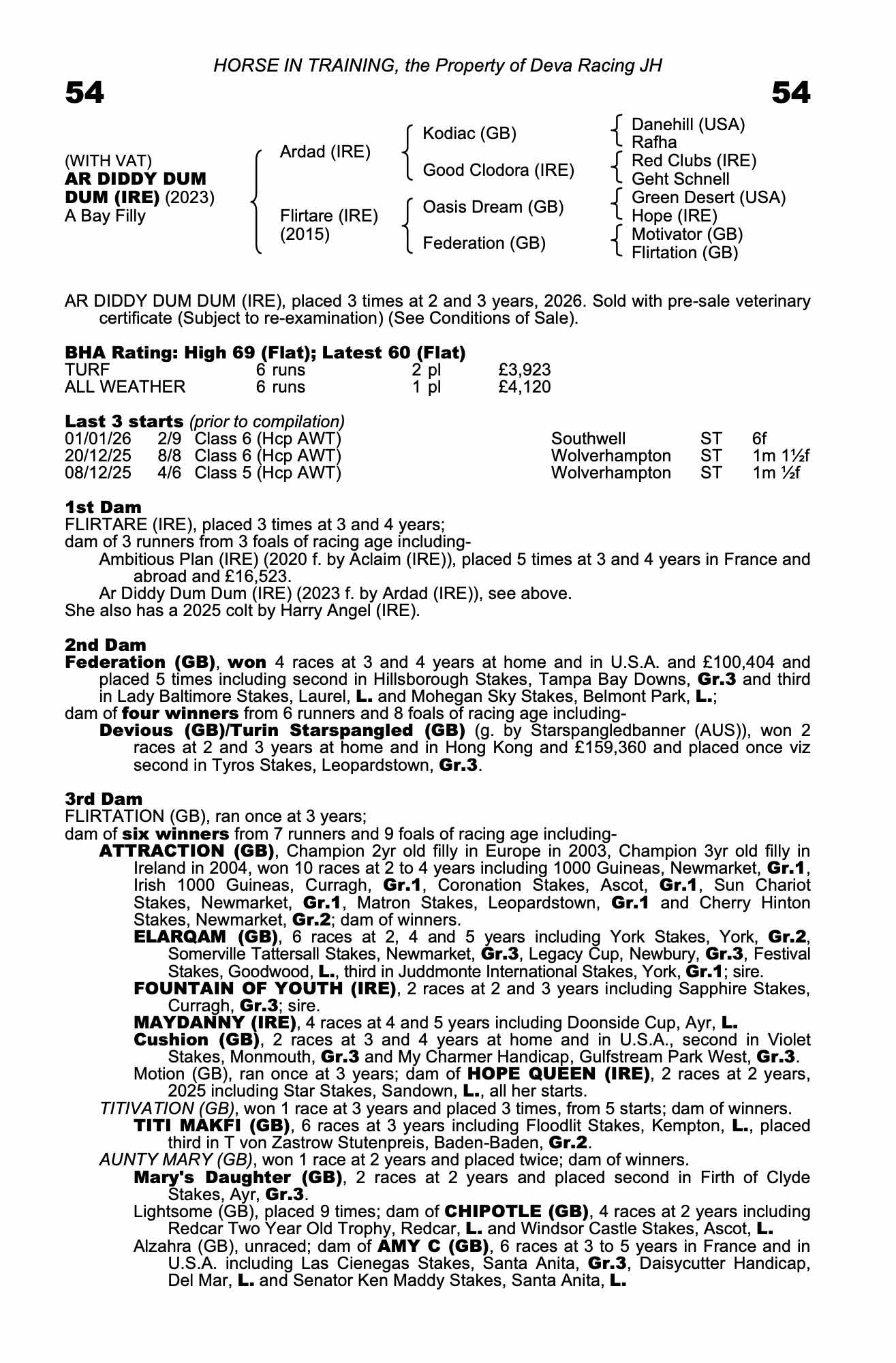 Vendor's Notes: Ar Diddy Dum Dum - 3 year old filly by Ardad who has ran well on the turf and all weather.