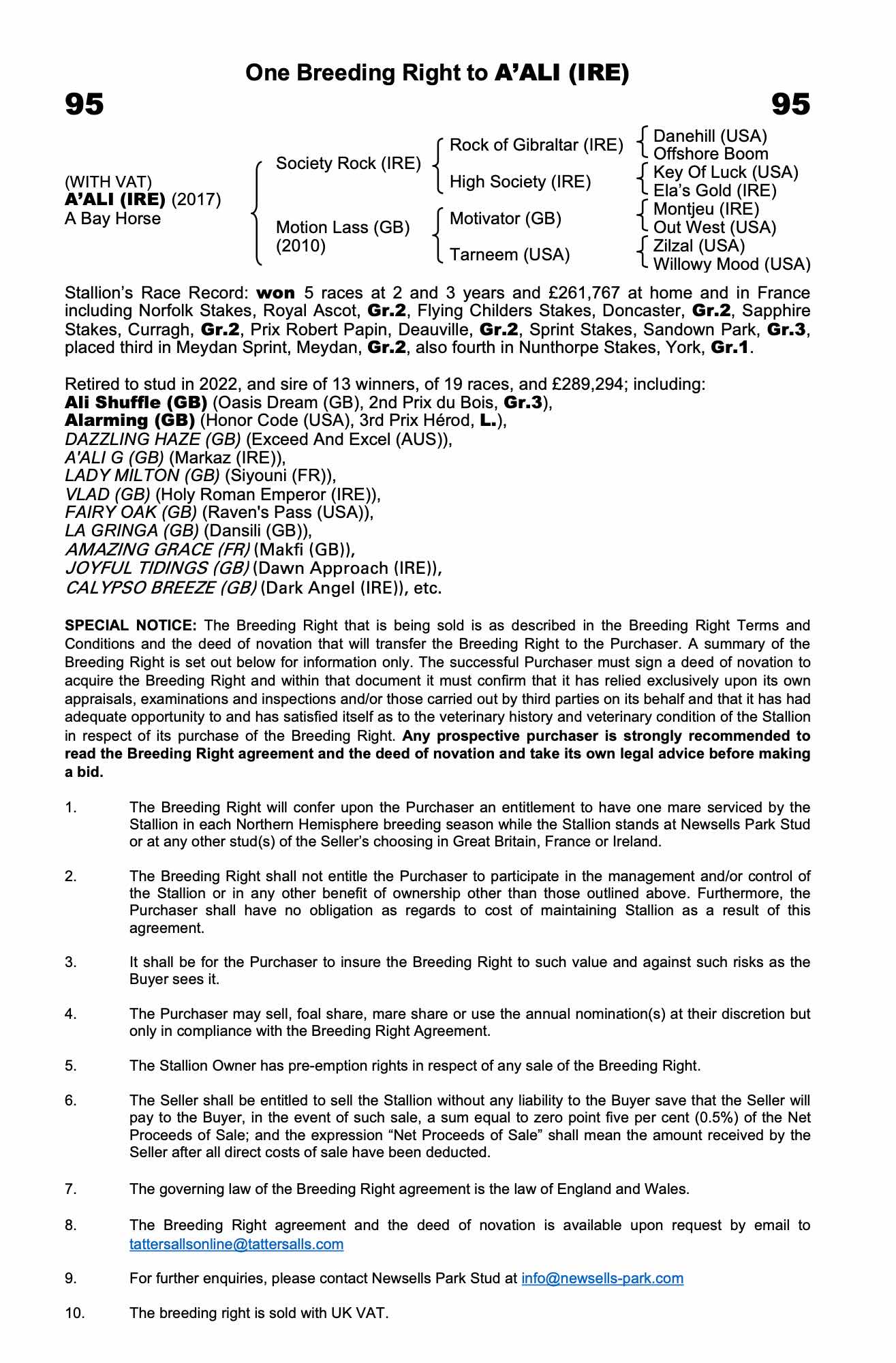 Vendor's Notes: The Breeding Right agreement and the deed of novation is available upon request by email to tattersallsonline@tattersalls.com
