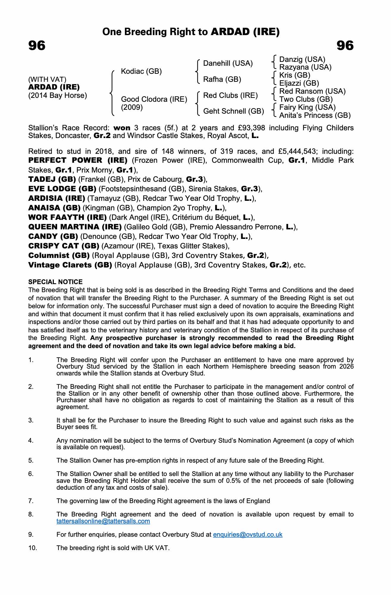 Vendor's Notes: The Breeding Right agreement and the deed of novation is available upon request by email to tattersallsonline@tattersalls.com