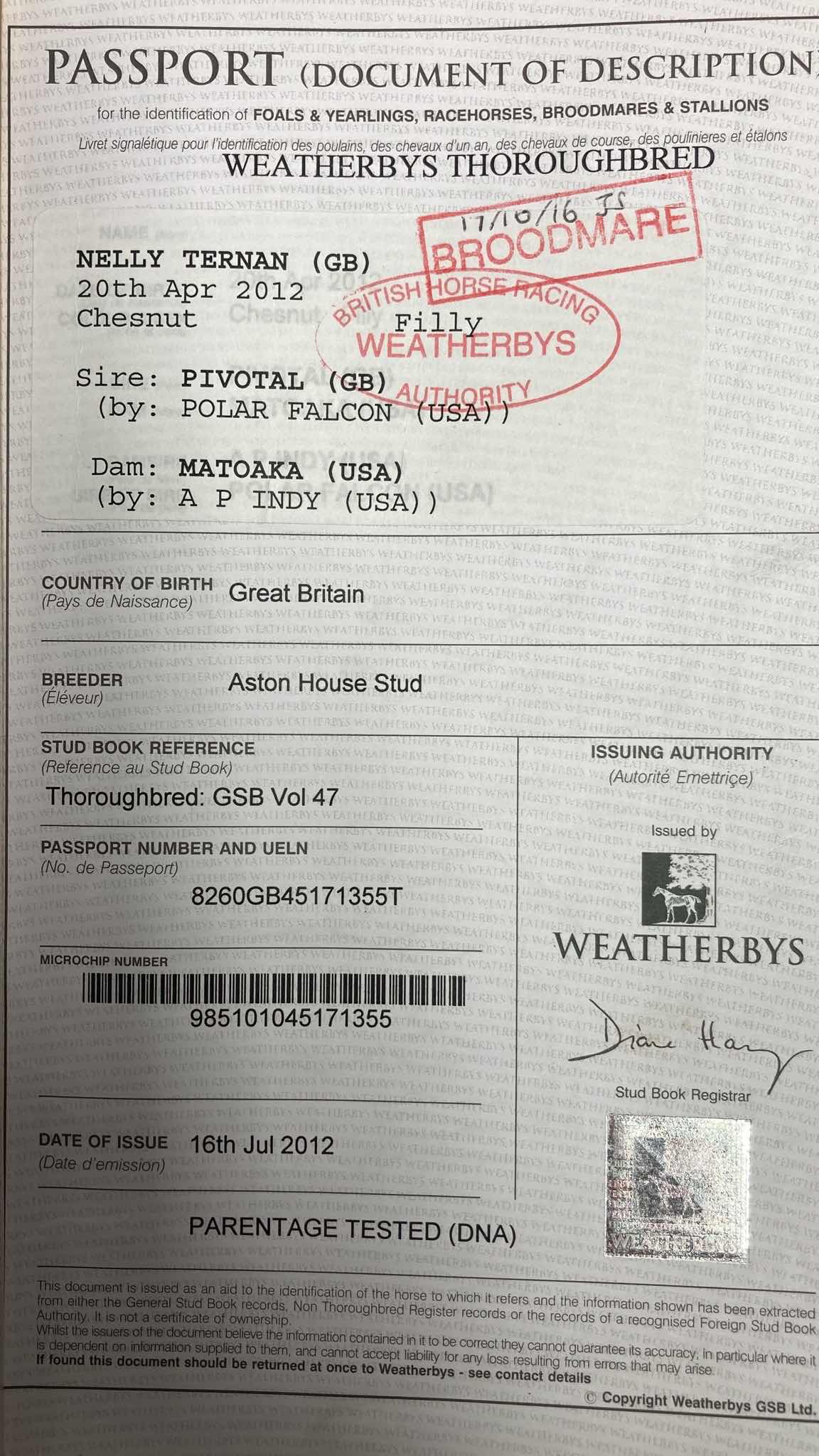 Vendor's Notes: Lovely Big Mare by Pivotal. She is full of bone, substance and quality. This mare has a great walk and comes from top pedigree. Already the dam of a winner. She should not be missed.