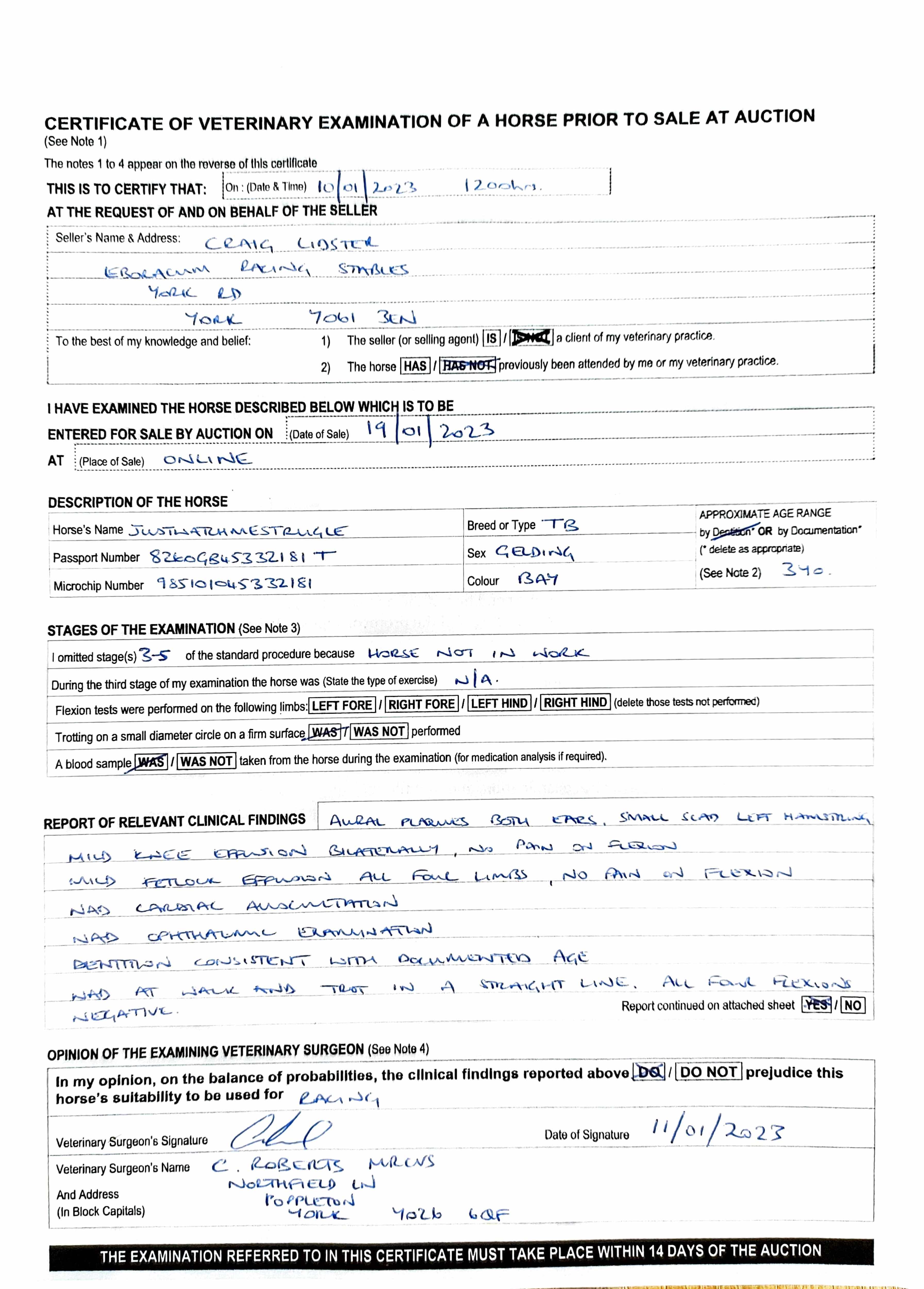 Vendor's Notes: SOUND, HEALTHY & READY TO RUN, SURPLUS TO OWNERS REQUIREMENTS.