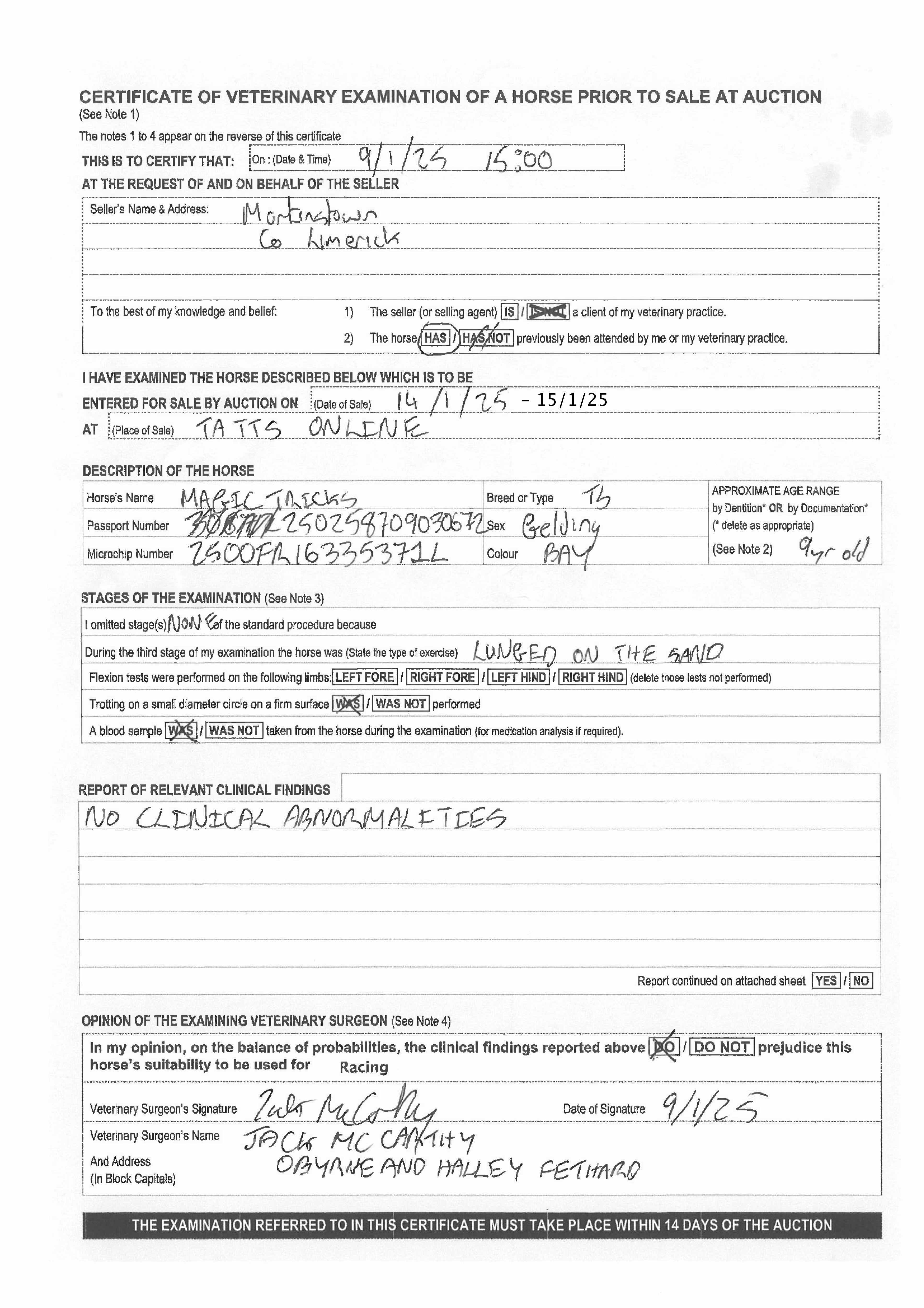 Vices/Declarations: Now sold IN TRAINING. Sold with a pre-sale veterinary certificate (Subject to re-examination) (See Conditions of Sale).