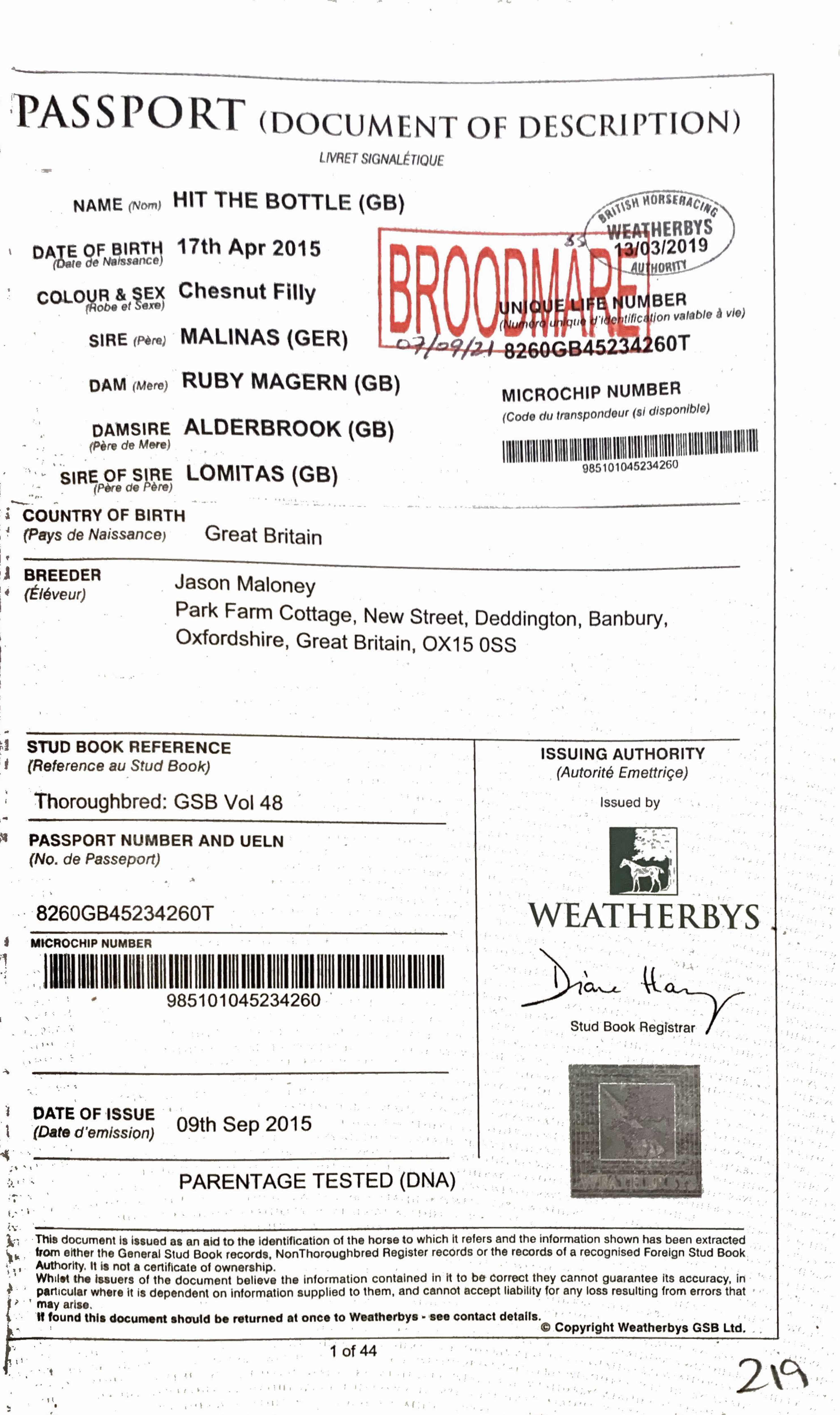 Vendor's Notes: Hit the Bottle is a well related mare with the lines going back to Ollie Magern, Billie Magern and Petite Margot. Her foals so far have all be straight and strong. She is in foal to the exciting Subjectivist. A lovely mare to handle and keeps producing quality foals. Only been sold as owner going back to Racing and not Broodmares.