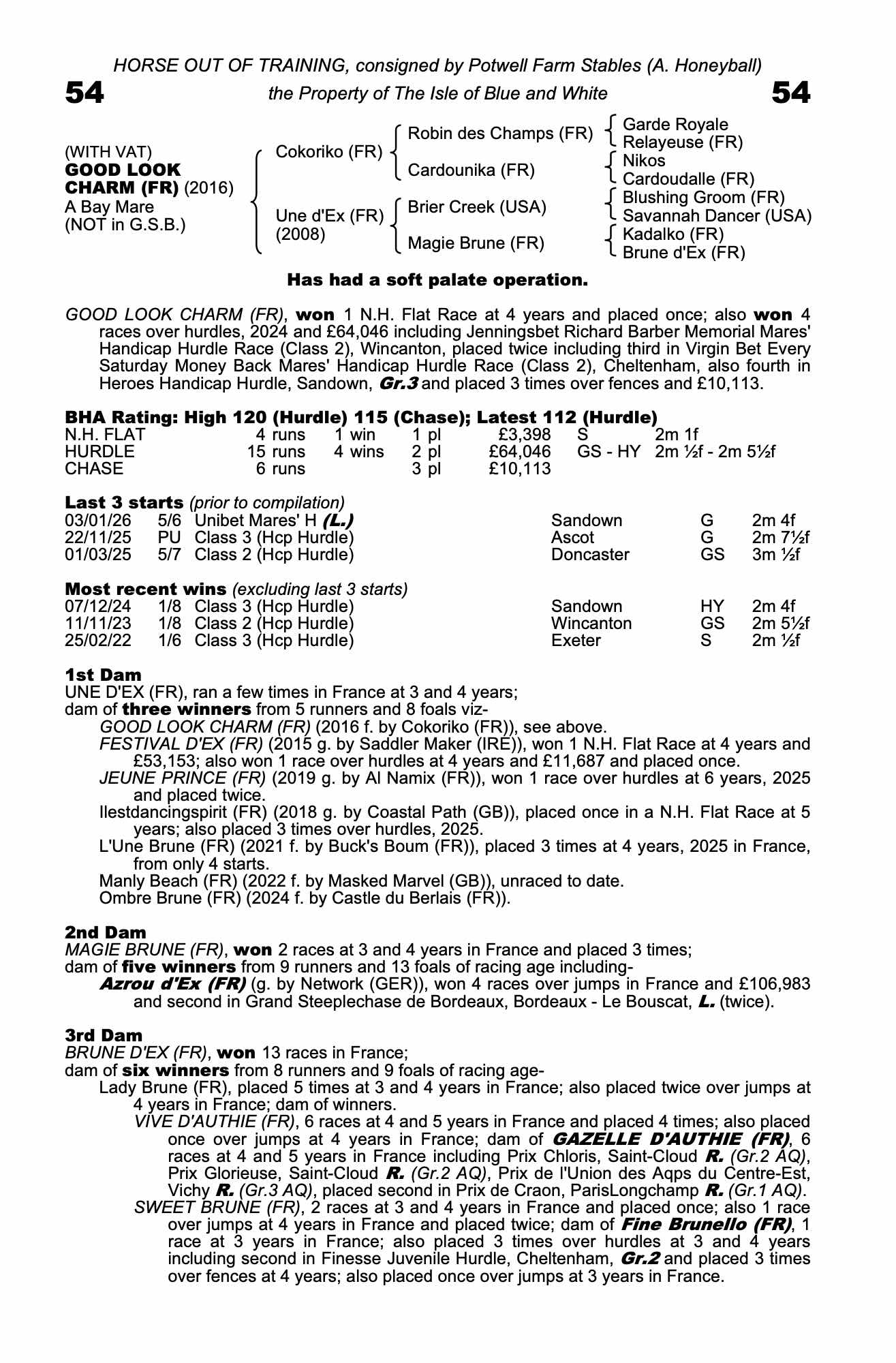 Vendor's Notes: GOOD LOOK CHARM (FR): 5 wins, £77,557 viz. winner of a N.H. Flat Race at 4