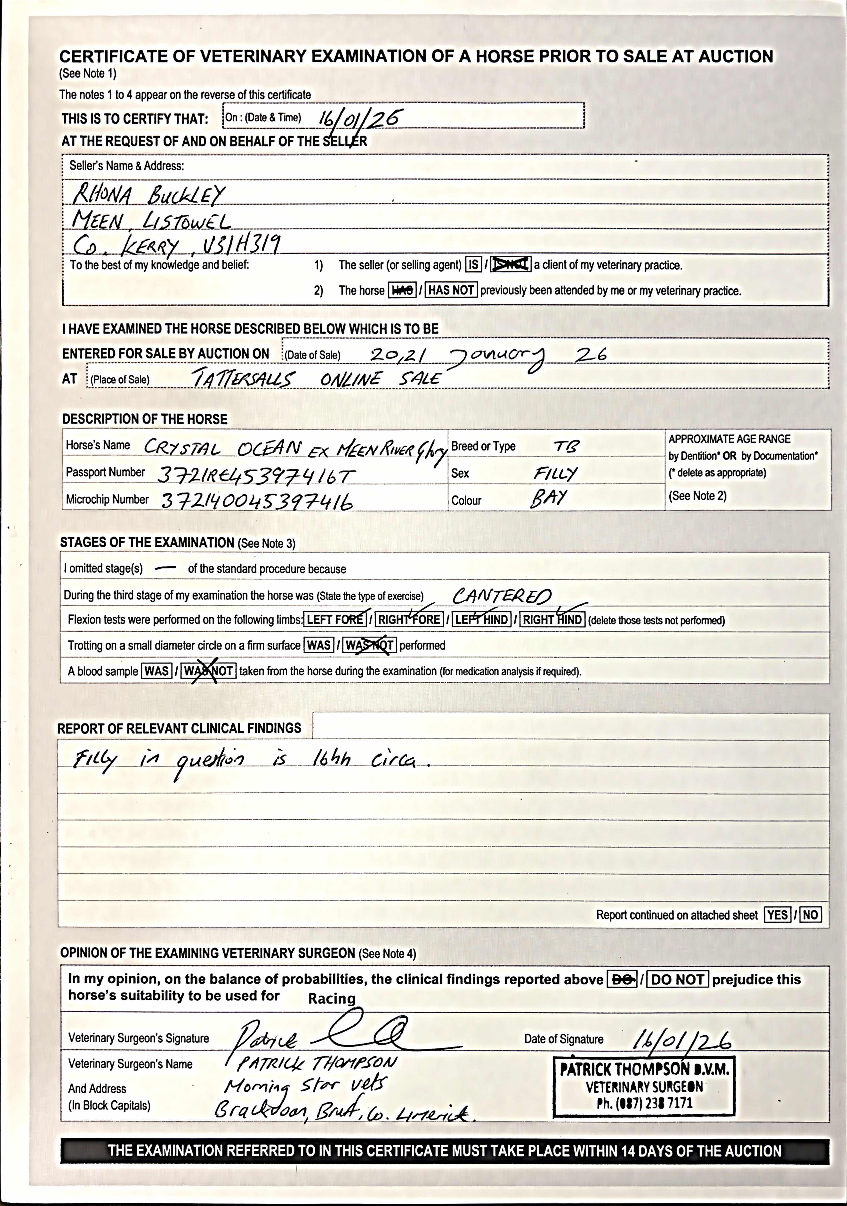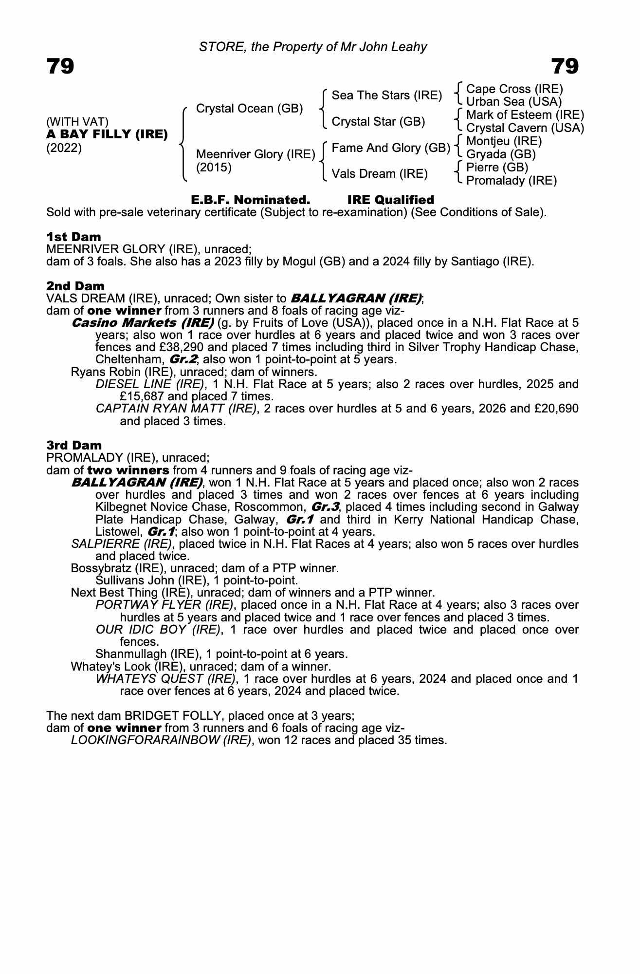 Vendor's Notes: Crystal Ocean filly very well handled, lovely mover, has been long reigned. Lovely mind, does everything right. Her page is improving all the time with another win on 01.01.26 by Captain Ryan Matt in Tramore by 15 lengths.