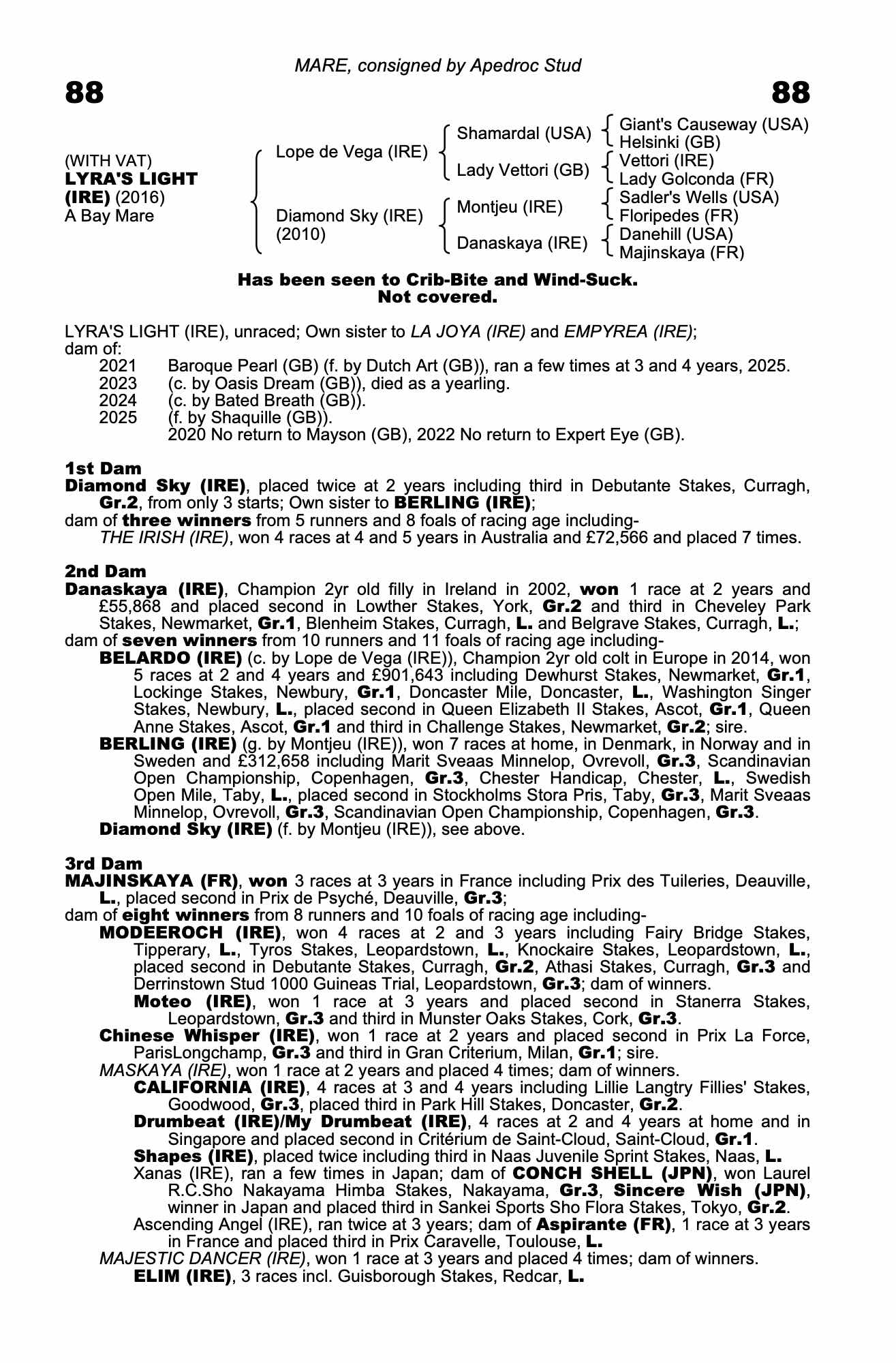 Vendor's Notes: A mare by Lope de Vega out of Diamond Sky, closely related to Belardo, sire of four Group 1 winners. She sold for 360,000 Guineas as a yearling. She was injured in training and never ran. She has produced four foals, three outstanding specimens with good walks. Please see lot 694 of December 2025 Tattersalls Foal Sale for a recent example of her progeny. One of her foals died as a yearling, one raced a few times and one will be a two year old next year. Two foals made multiples of their covering fees and a third died before it was sold. She was not covered in 2025 to reset her foaling date.