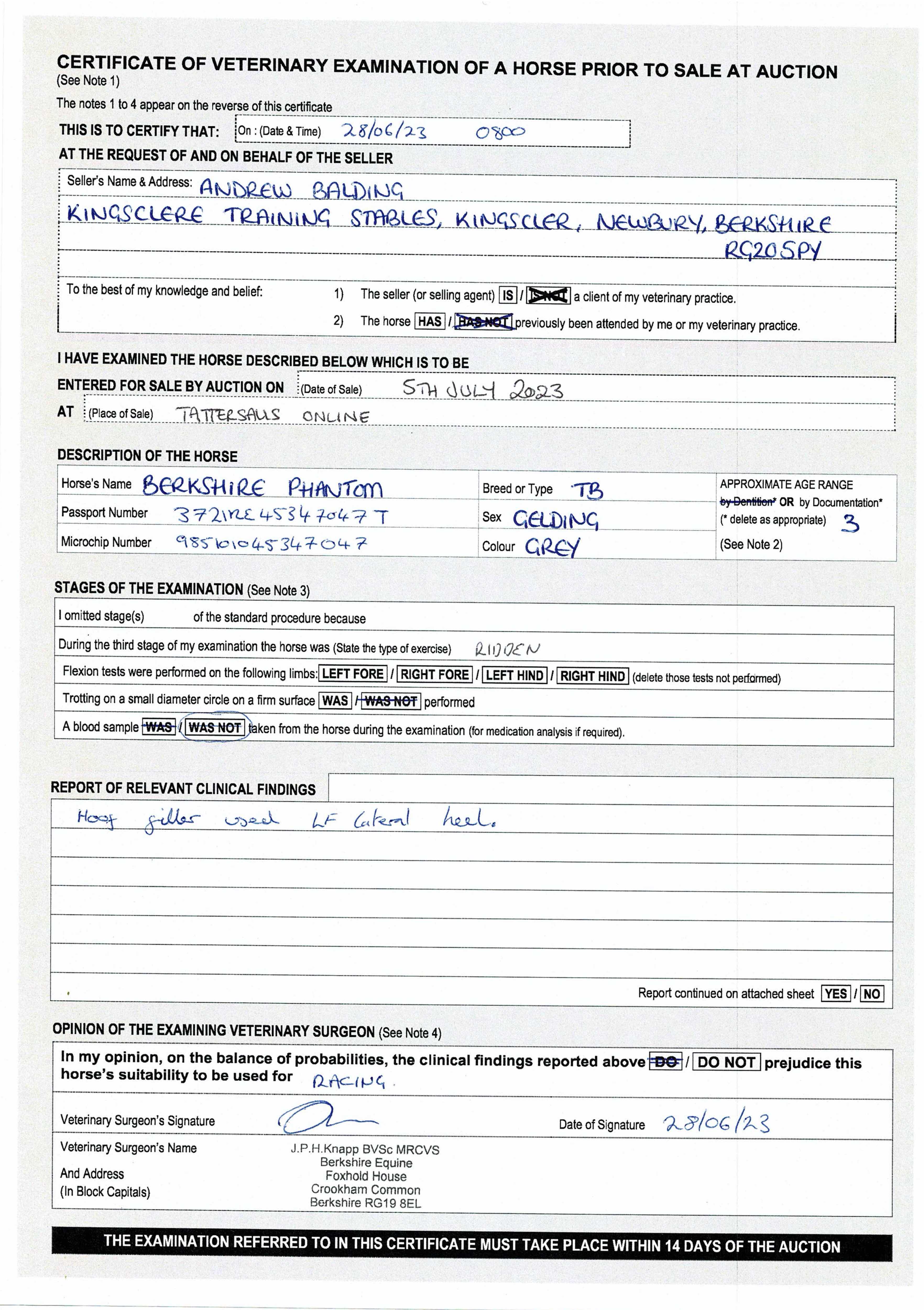 Vendor's Notes: Berkshire Phantom is a dual winner over 7 furlongs this year. He is sound, in full work and a straightforward ride. He has no veterinary issues or vices.