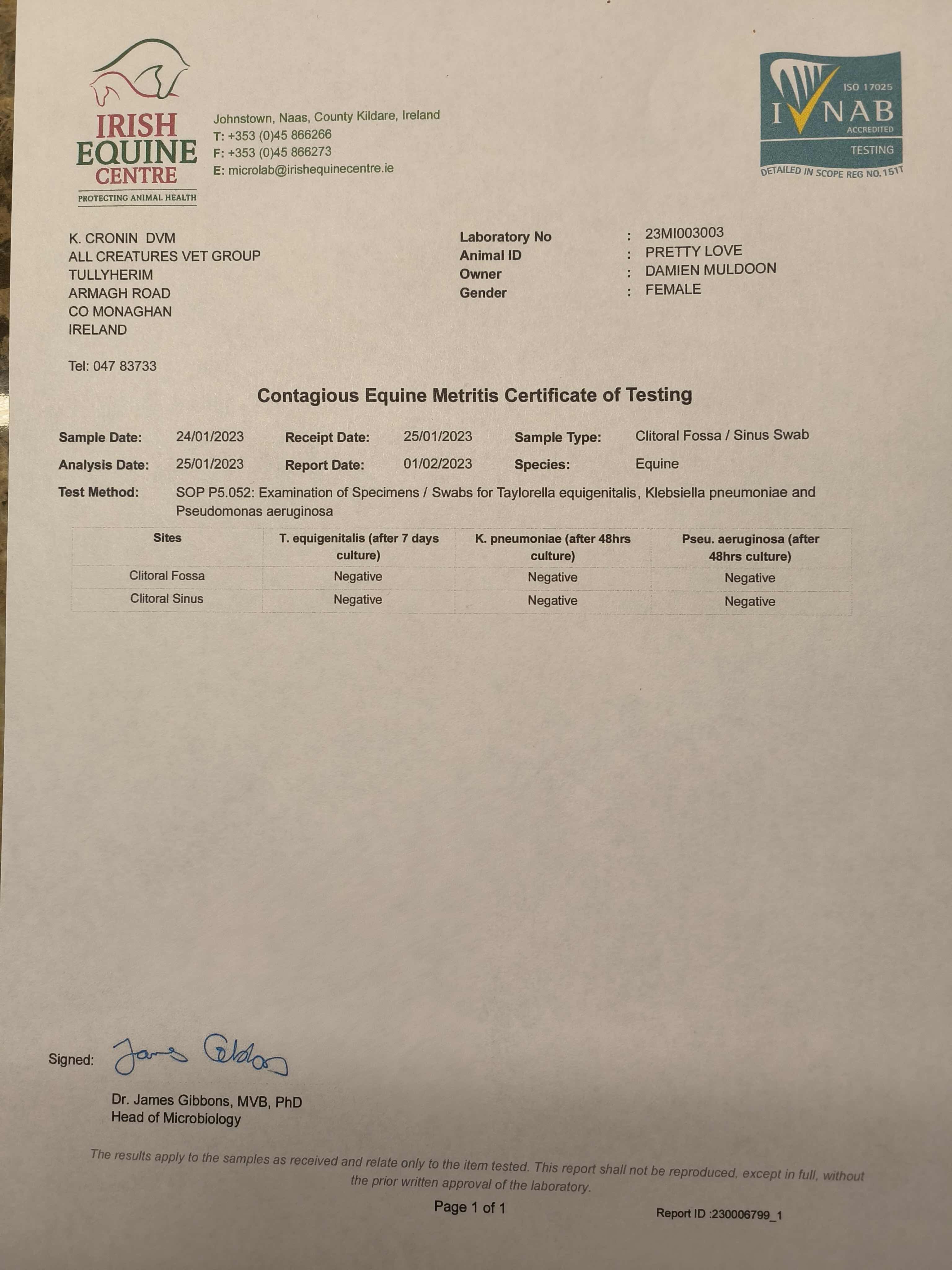 Vendor's Notes: Nice mare 16.1 HH, easy to foal down and a good mother. Being sold as part of a dispersal. 2022 filly by Dragon Pulse can be viewed at Harcourt Stud, Naas, Co. Kildare. Further videos can be found on twitter @FoxfieldStud. Being sold with EVA, CEM and breeding health cert, ready for the 2023 covering season.