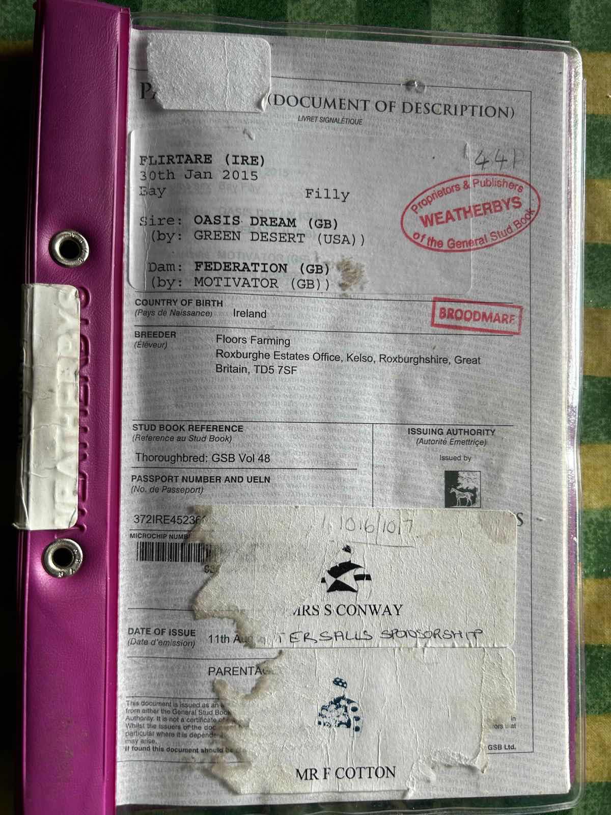Vices/Declarations: Has been seen to Weave and Wind-Suck. The influenza vaccinations are not compliant with the current BHA requirements and further vaccinations will be required.