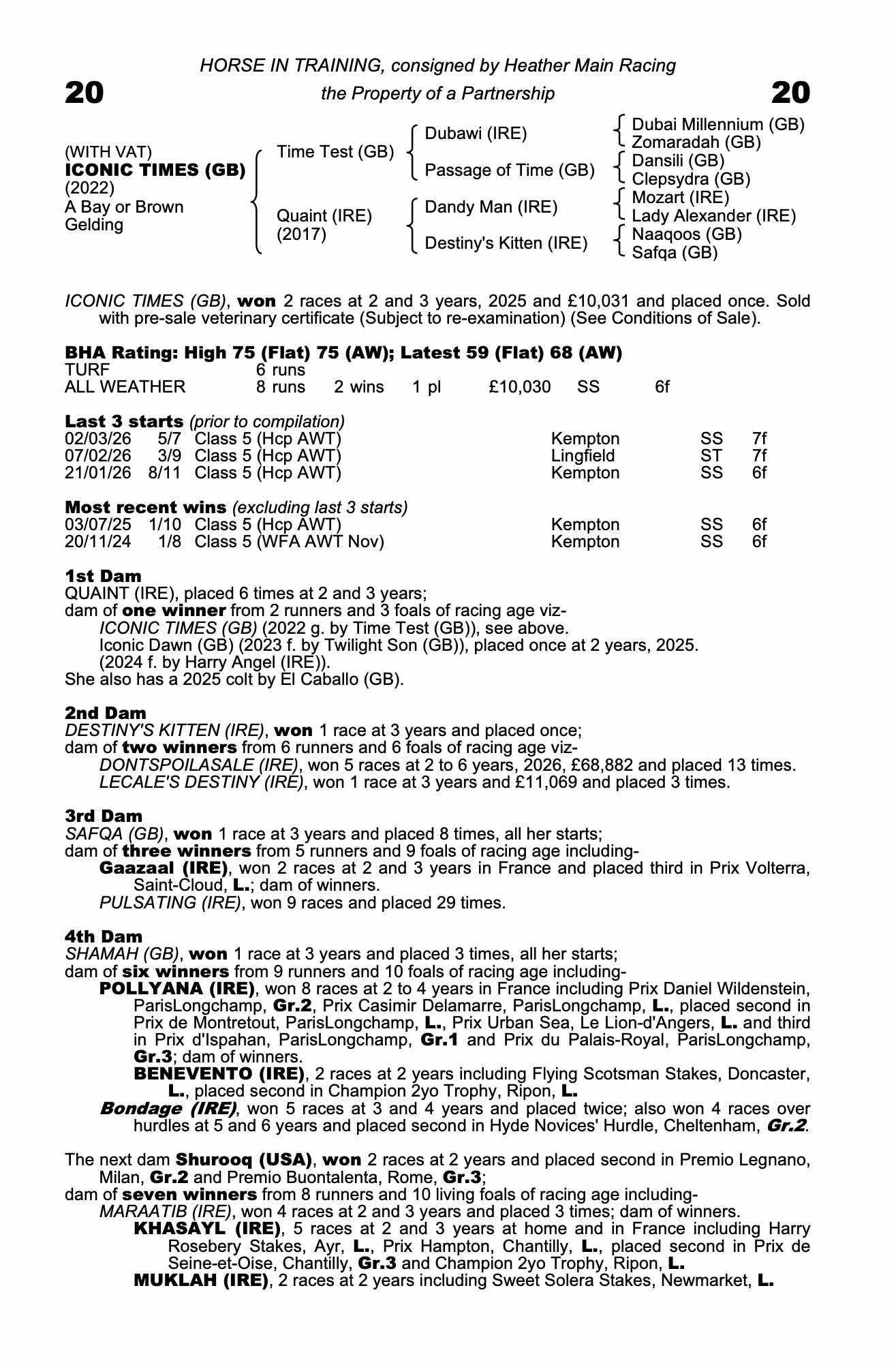 Monday 16 March:  ICONIC TIMES (GB), placed twice and £11,062.